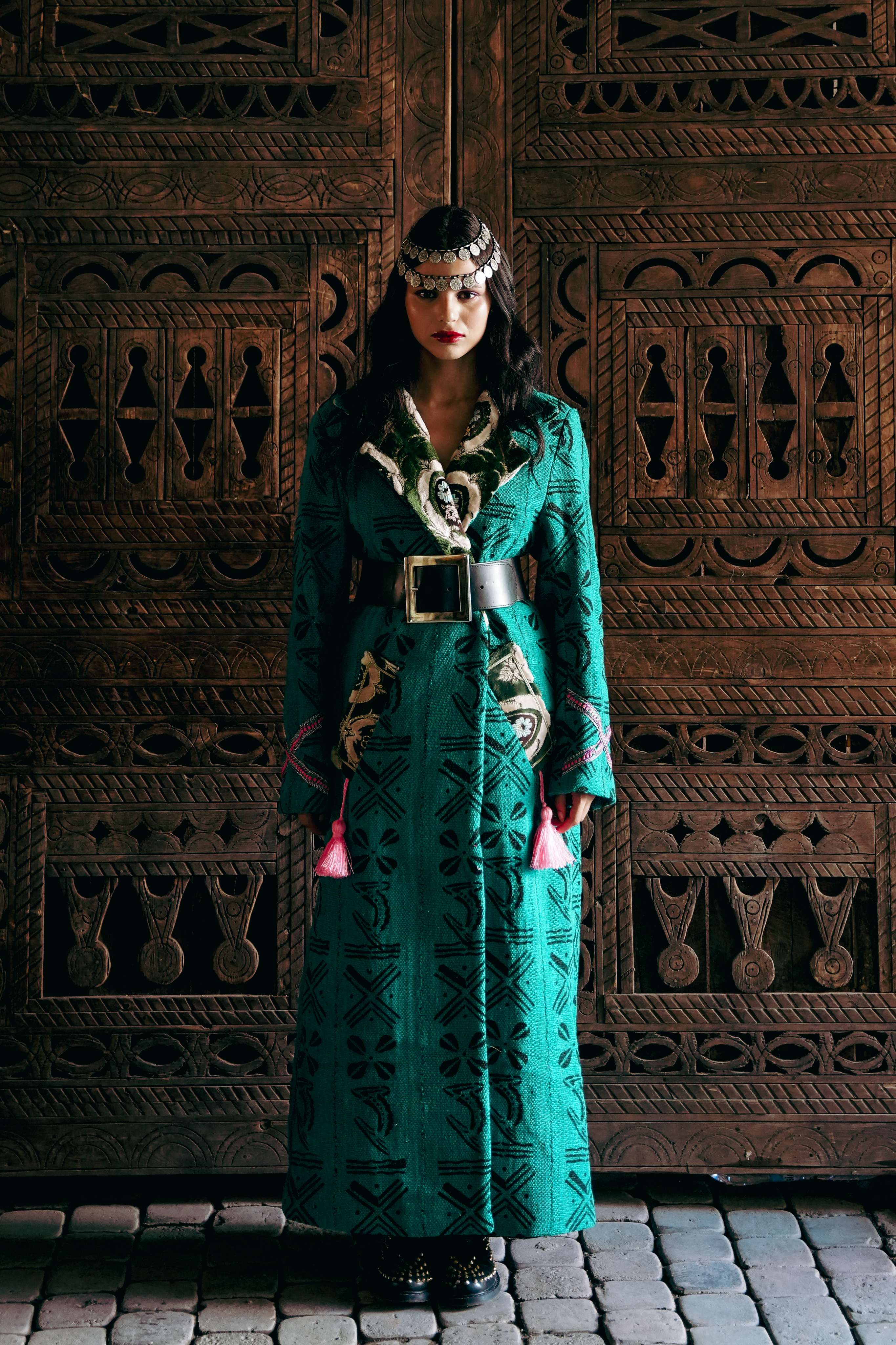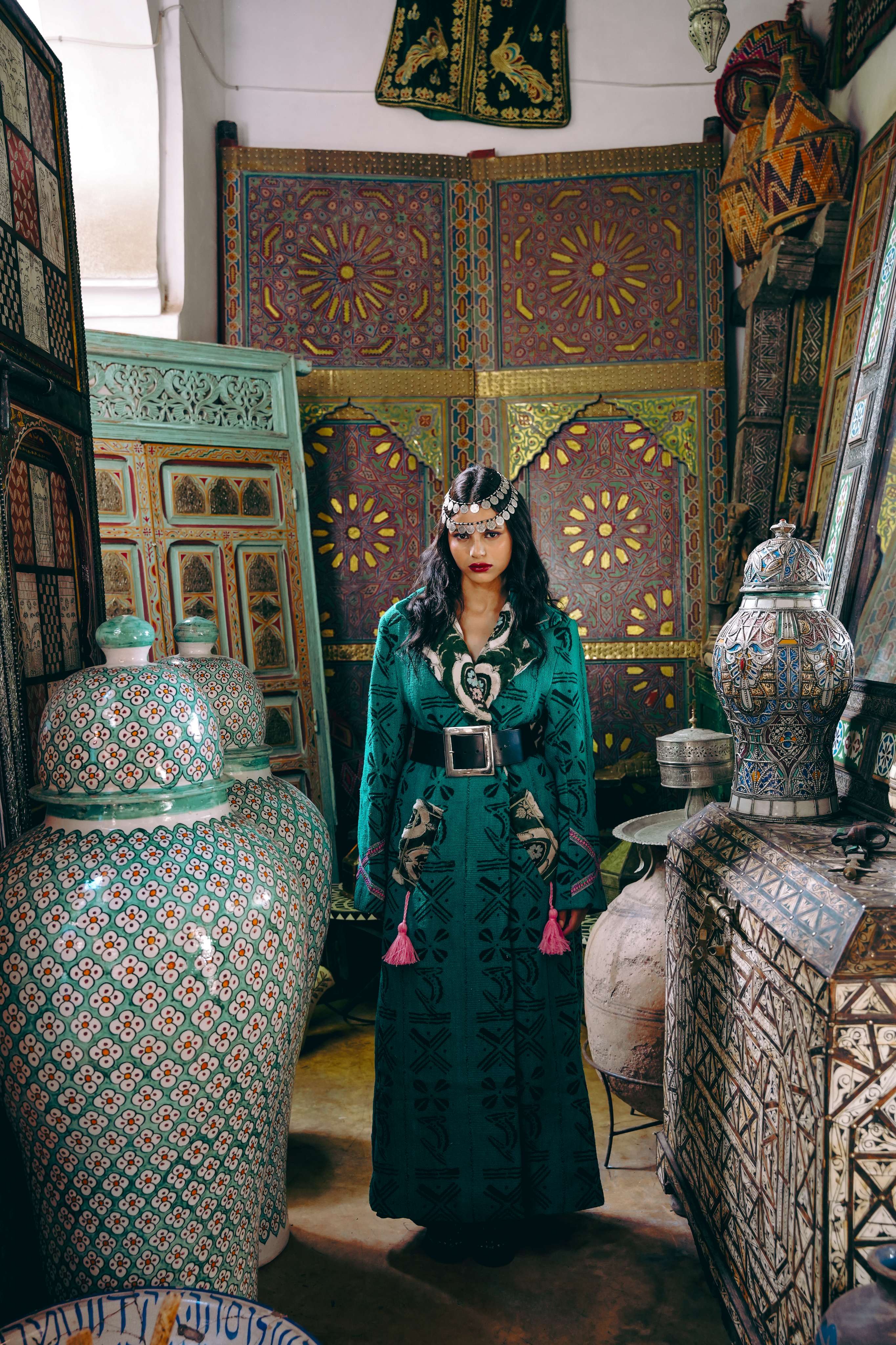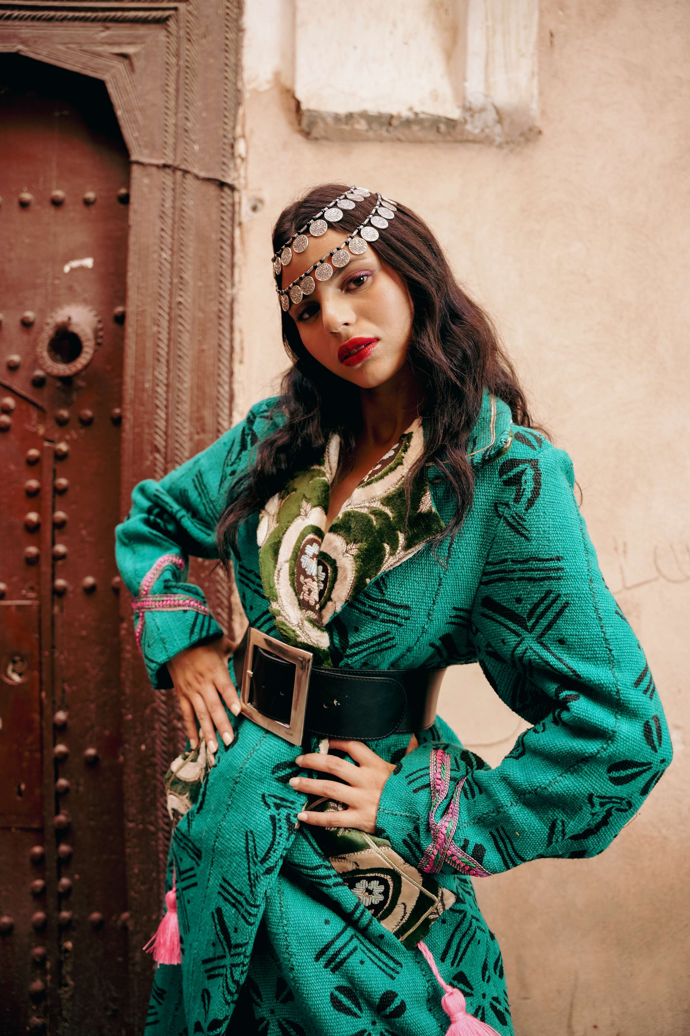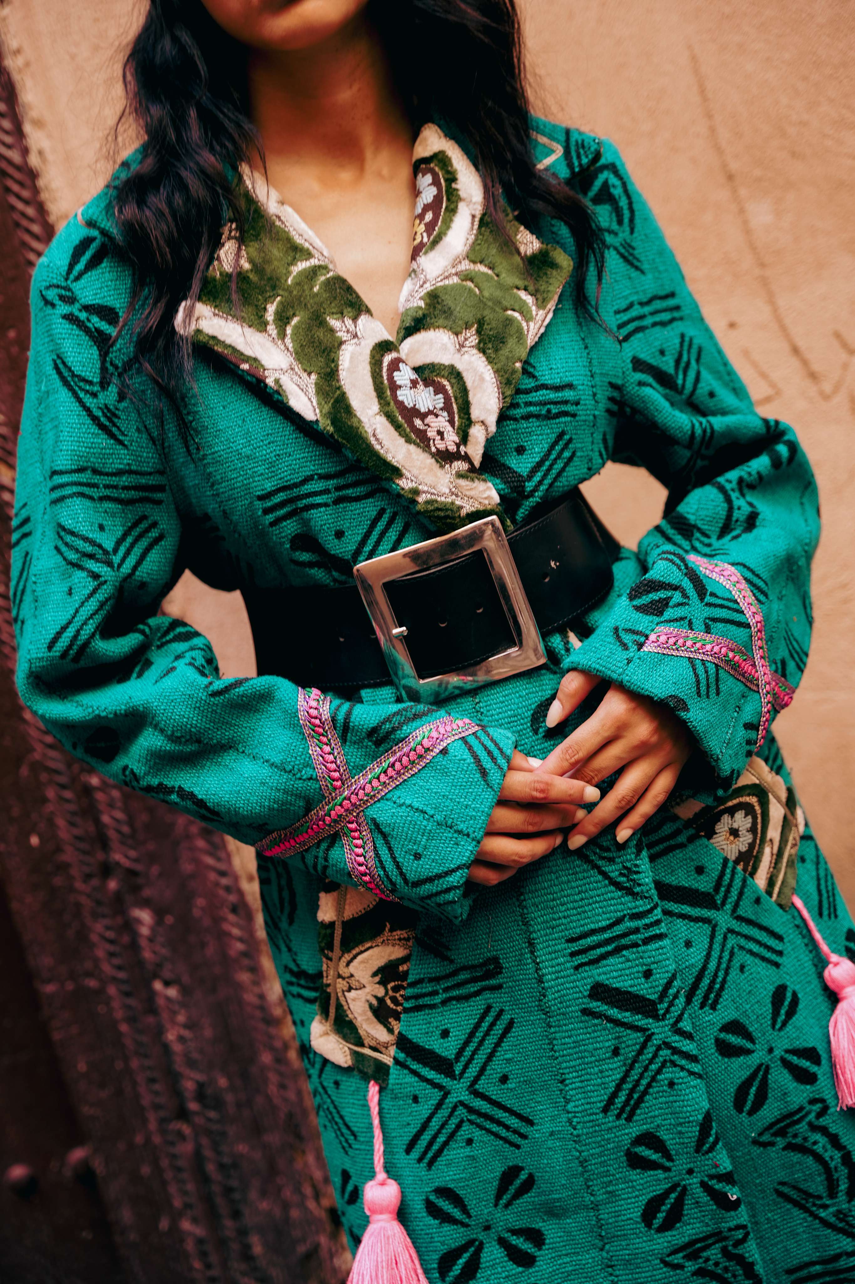 Inspired by the miracle of finding lush life in the arid landscape, the Desert Aura Trench is a piece of pure vitality. Its stunning, deep green hue is the color of hidden springs and thriving palms, while the dramatic, wing-like collar evokes the exotic birds that find sanctuary in these sacred places. The geometric print grounds the piece in the ancient patterns of the earth, and a joyful surprise of pink tassels adds a burst of desert-bloom color. Handcrafted in Morocco, this is a truly regal coat for the royal one who carries their own powerful aura.