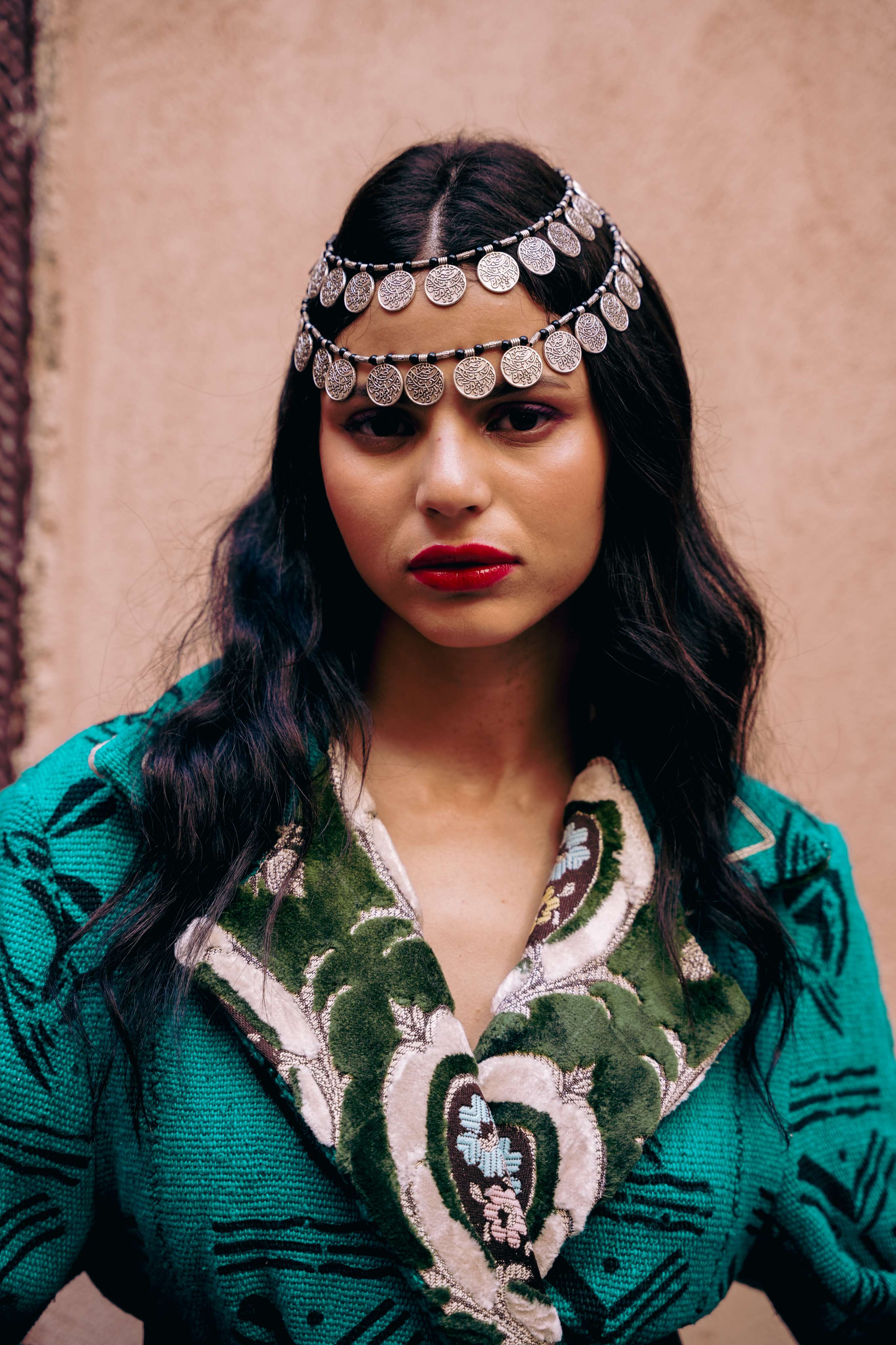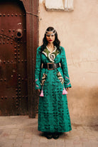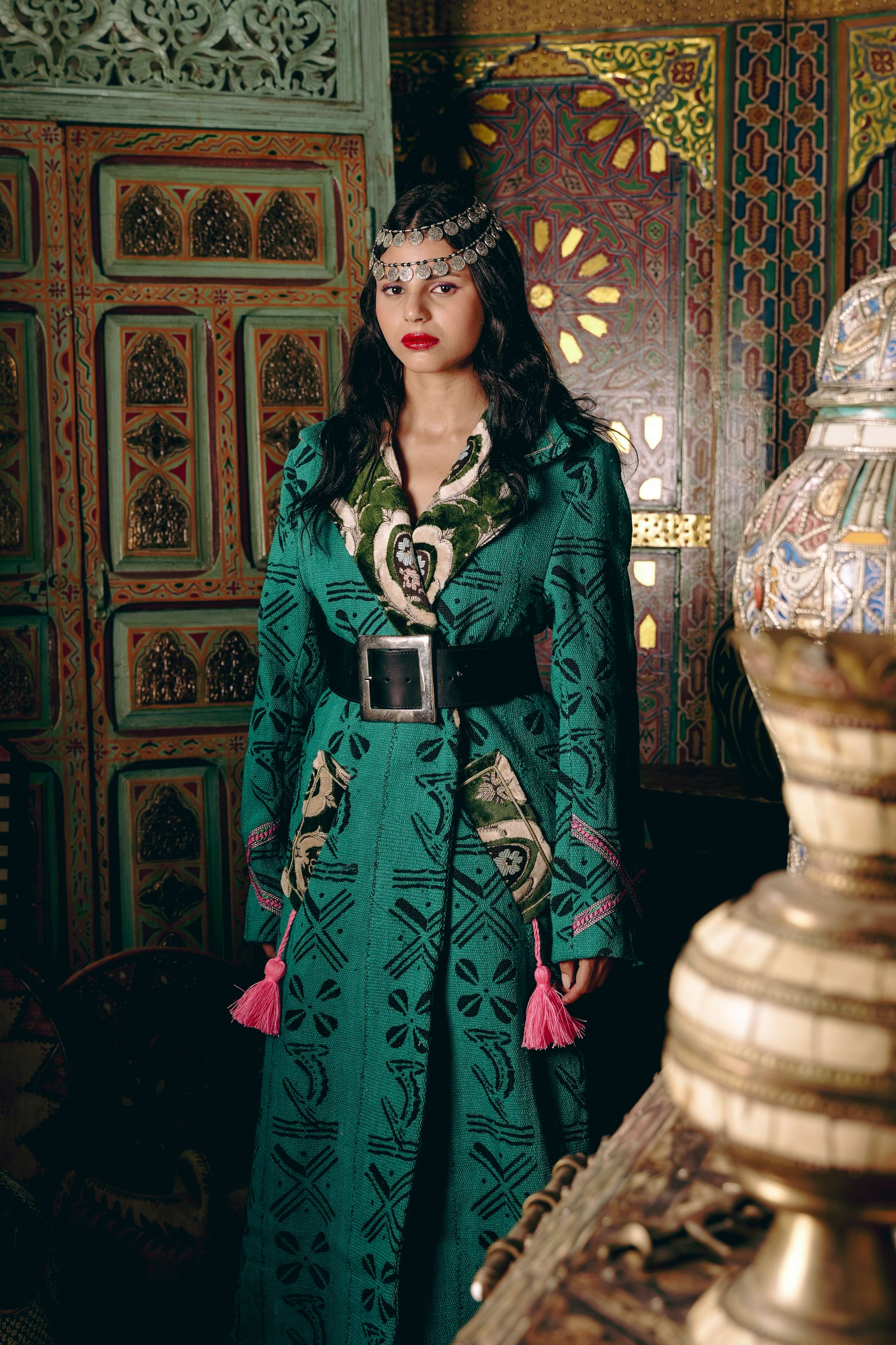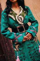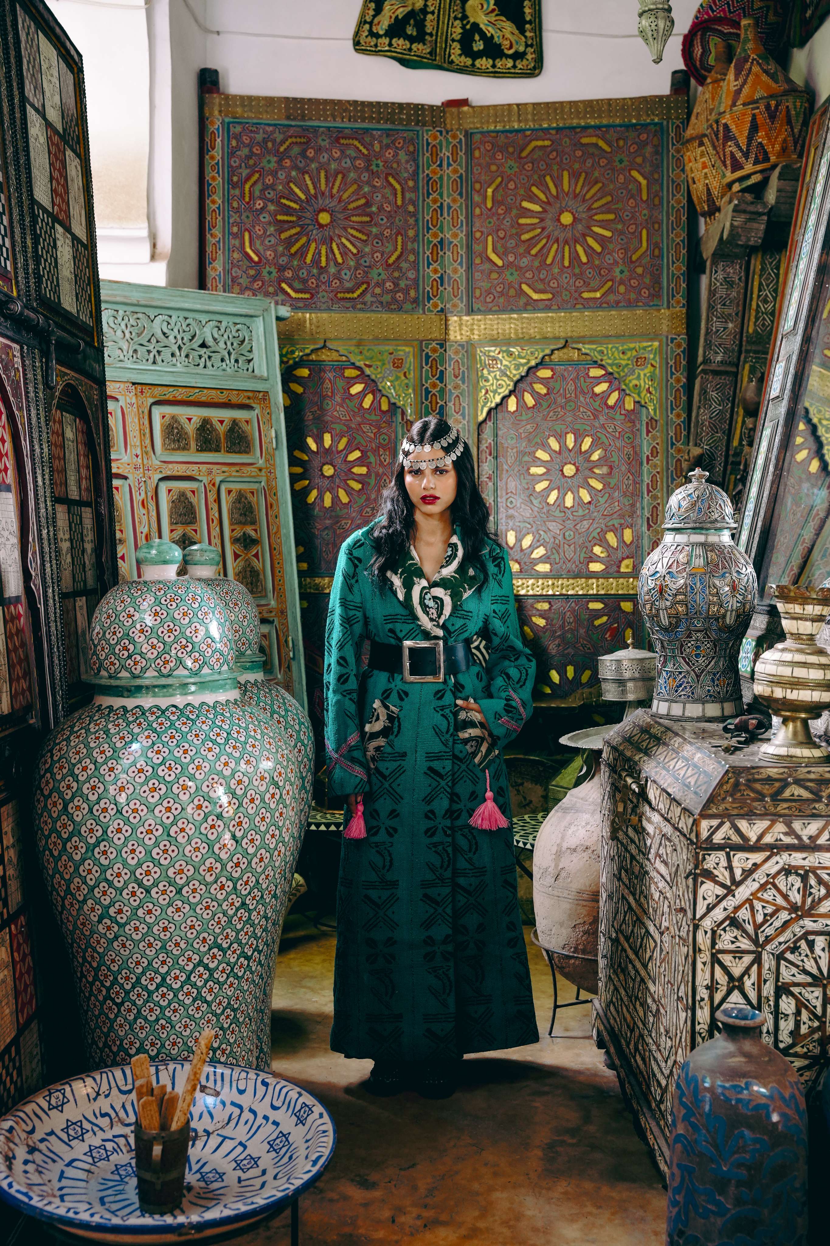 Inspired by the miracle of finding lush life in the arid landscape, the Desert Aura Trench is a piece of pure vitality. Its stunning, deep green hue is the color of hidden springs and thriving palms, while the dramatic, wing-like collar evokes the exotic birds that find sanctuary in these sacred places. The geometric print grounds the piece in the ancient patterns of the earth, and a joyful surprise of pink tassels adds a burst of desert-bloom color. Handcrafted in Morocco, this is a truly regal coat for the royal one who carries their own powerful aura.
