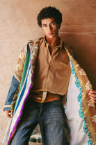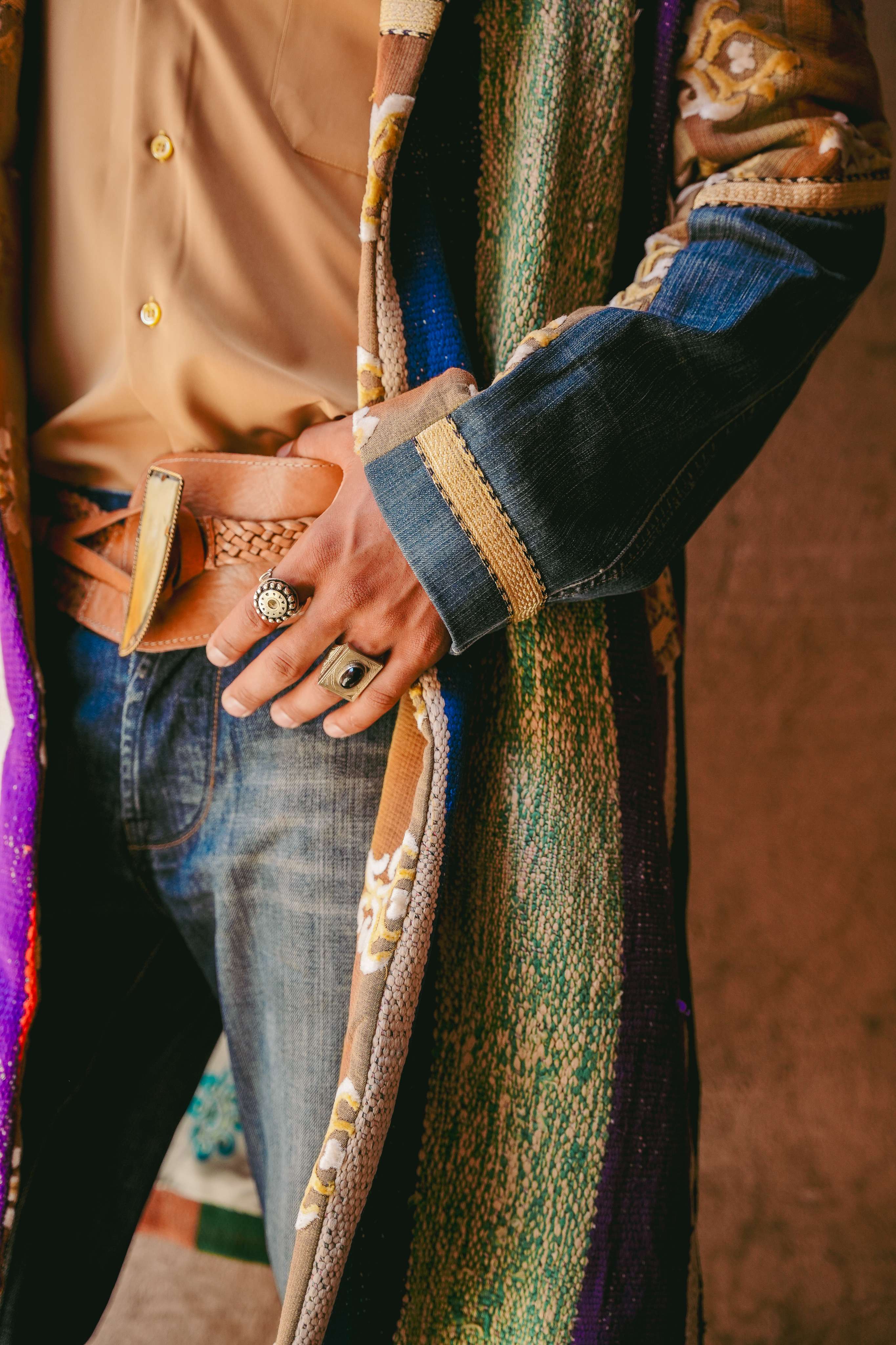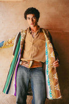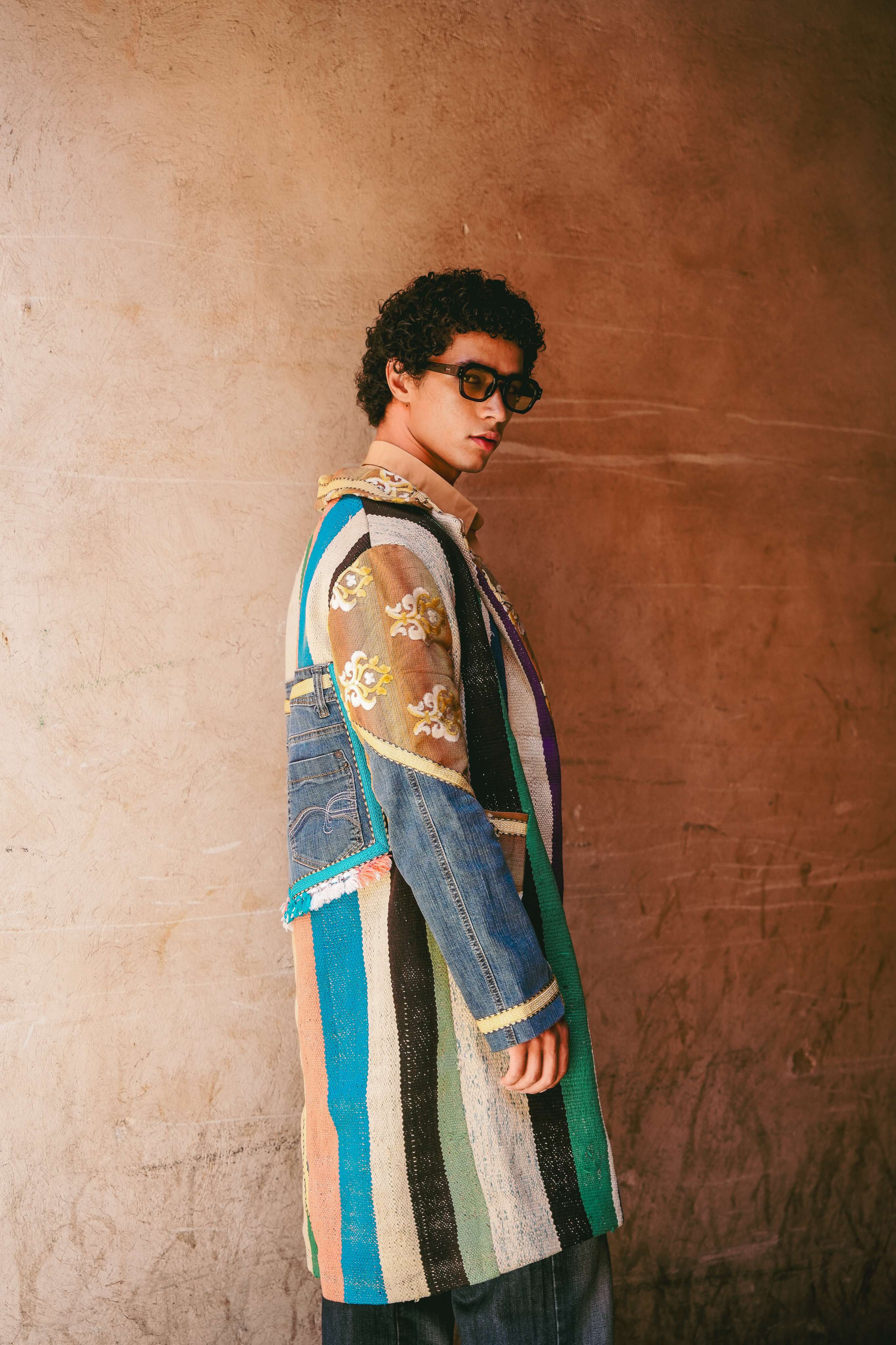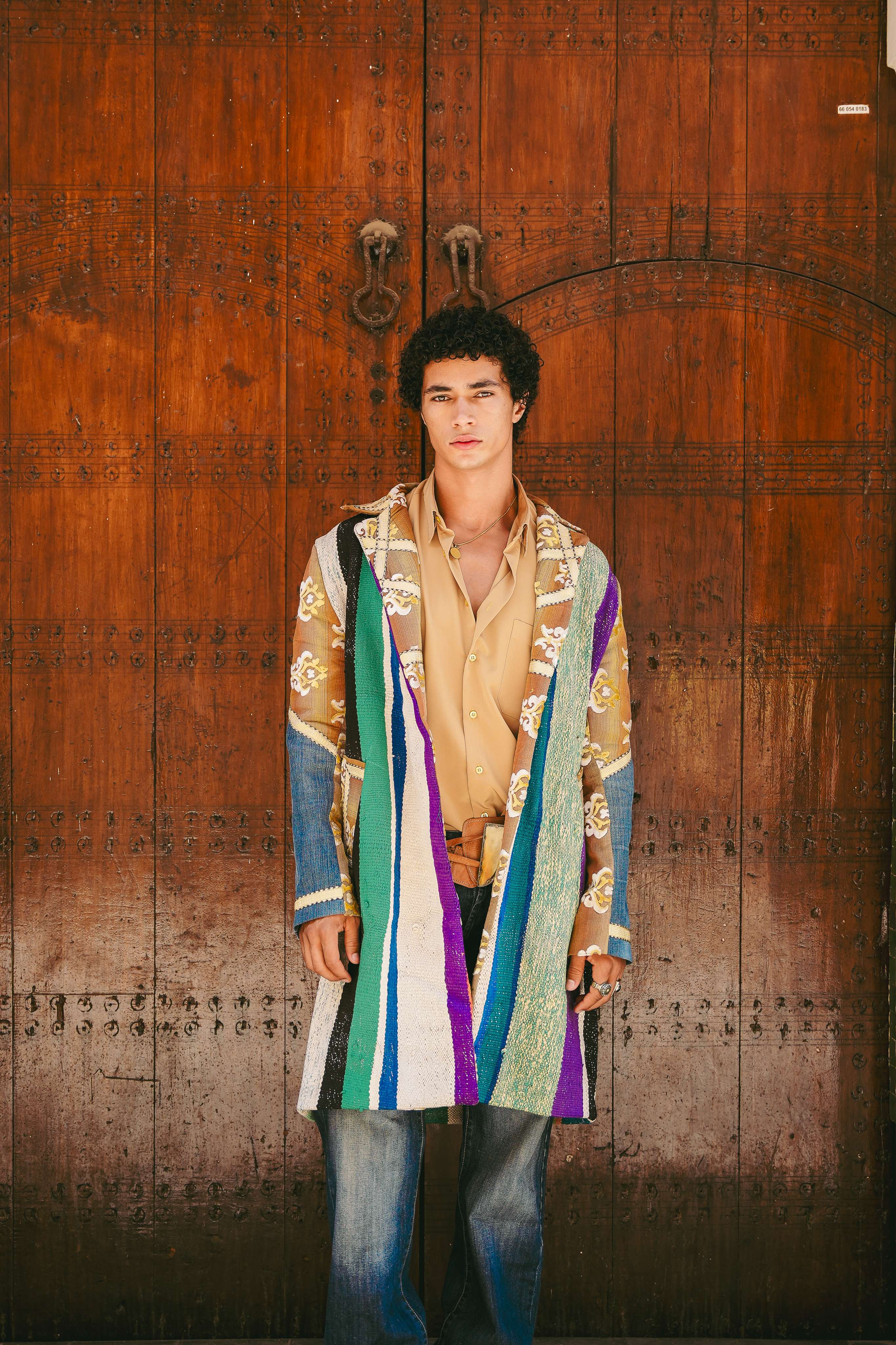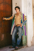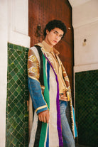Inspired by the journey through Morocco's varied terrains, where landscapes shift from one moment to the next, the Desert Glow Coat is a rich collage of experiences. The rustic, striped panels echo the layered colors of ancient rock formations and hand-woven Berber textiles. Patches of upcycled denim are like finding a cool oasis in the heat, while flashes of gilded jacquard recall the opulence of a hidden kasbah catching the morning sun. Handcrafted in Morocco, this is a coat for the nomadic soul who carries their travels with them.
