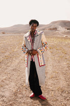 - Intricate Sequined Embroidery: Wide, cream-colored lapels and cuffs serve as a canvas for intricate geometric hand-embroidery in red and blue thread, punctuated with shimmering sequins for a touch of light.
