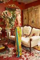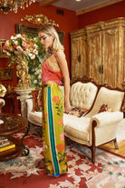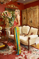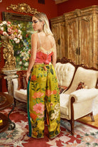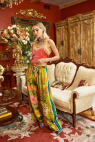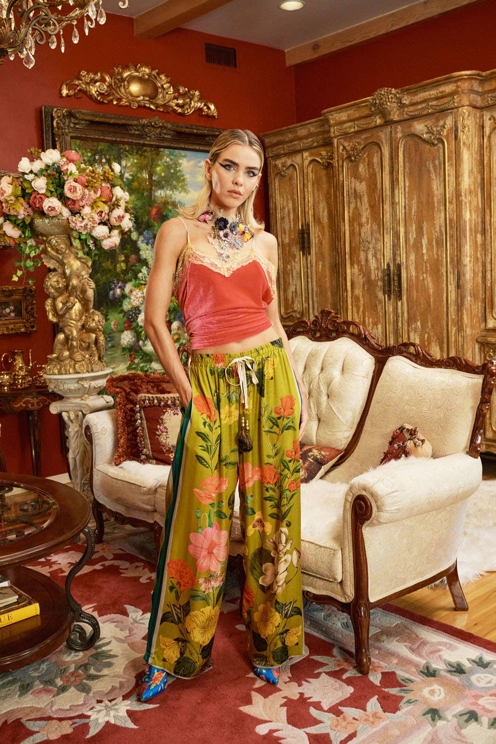 Style Notes: Channel the eclectic glamour shown in the photos by pairing these pants with a rich velvet camisole and a bold statement necklace. For a more understated take, style them with a simple cream silk tank top and elegant slides, letting the vibrant print take center stage. The necklace and other accessories are shown for styling inspiration and are not included.