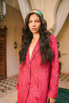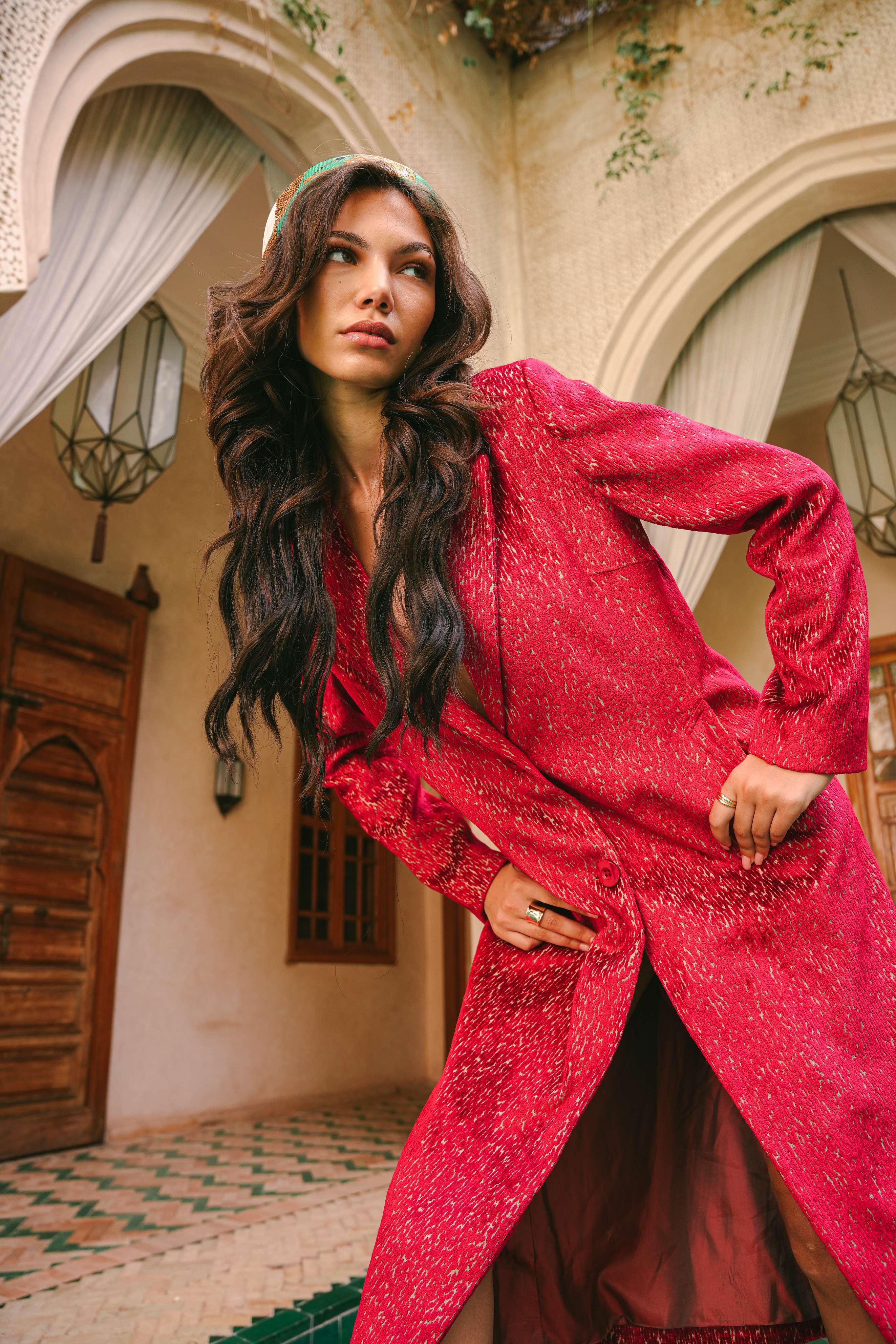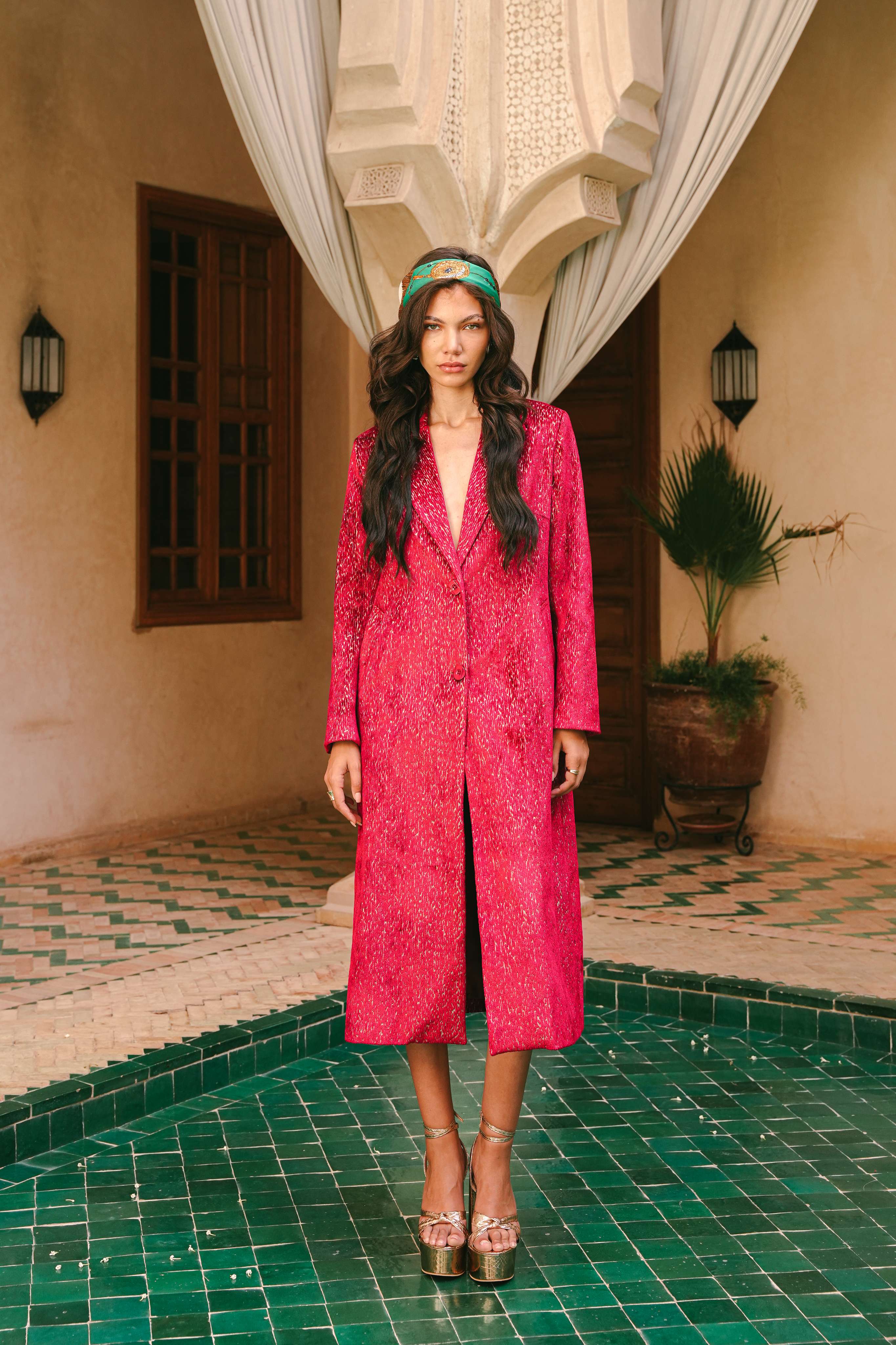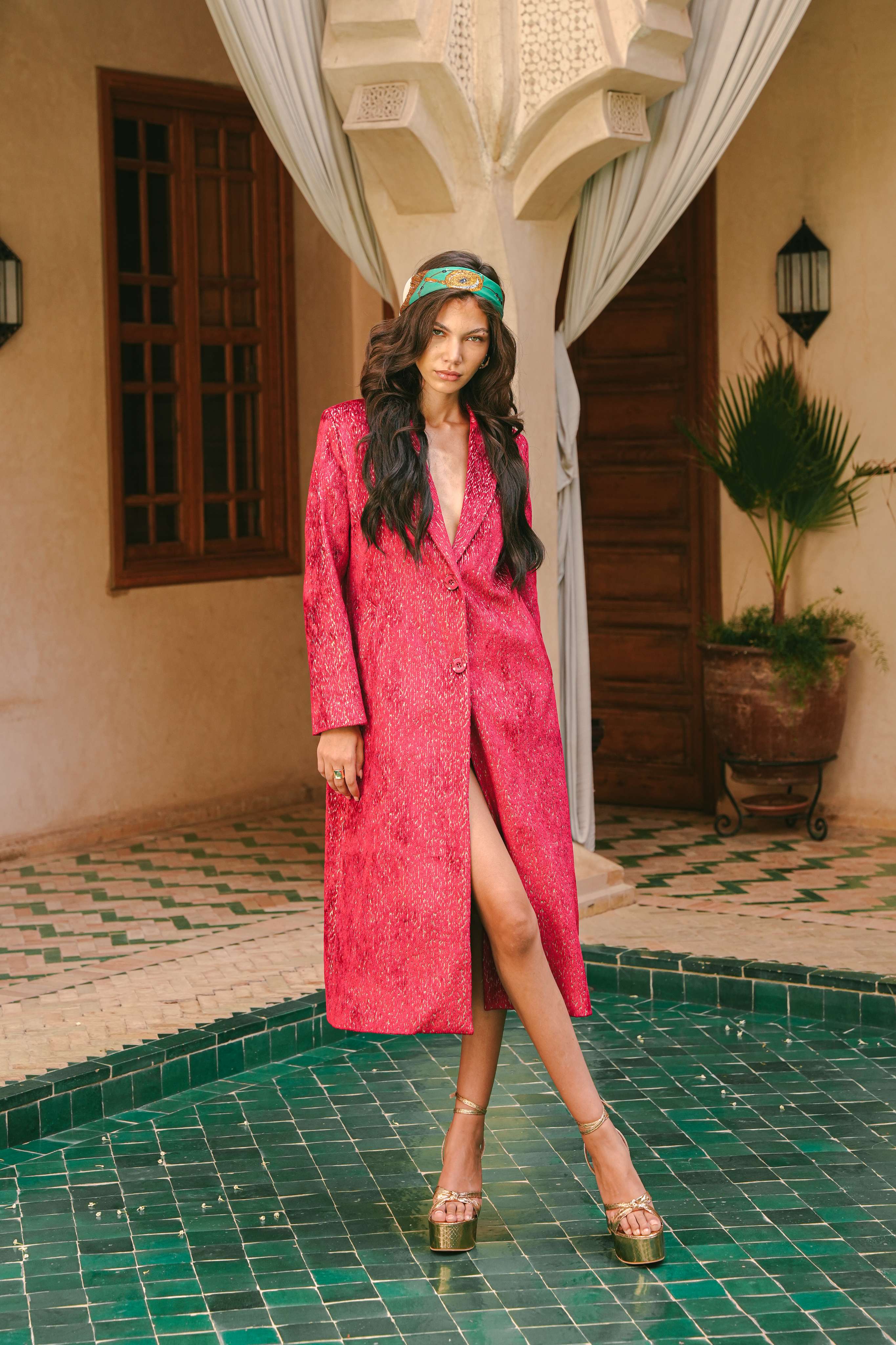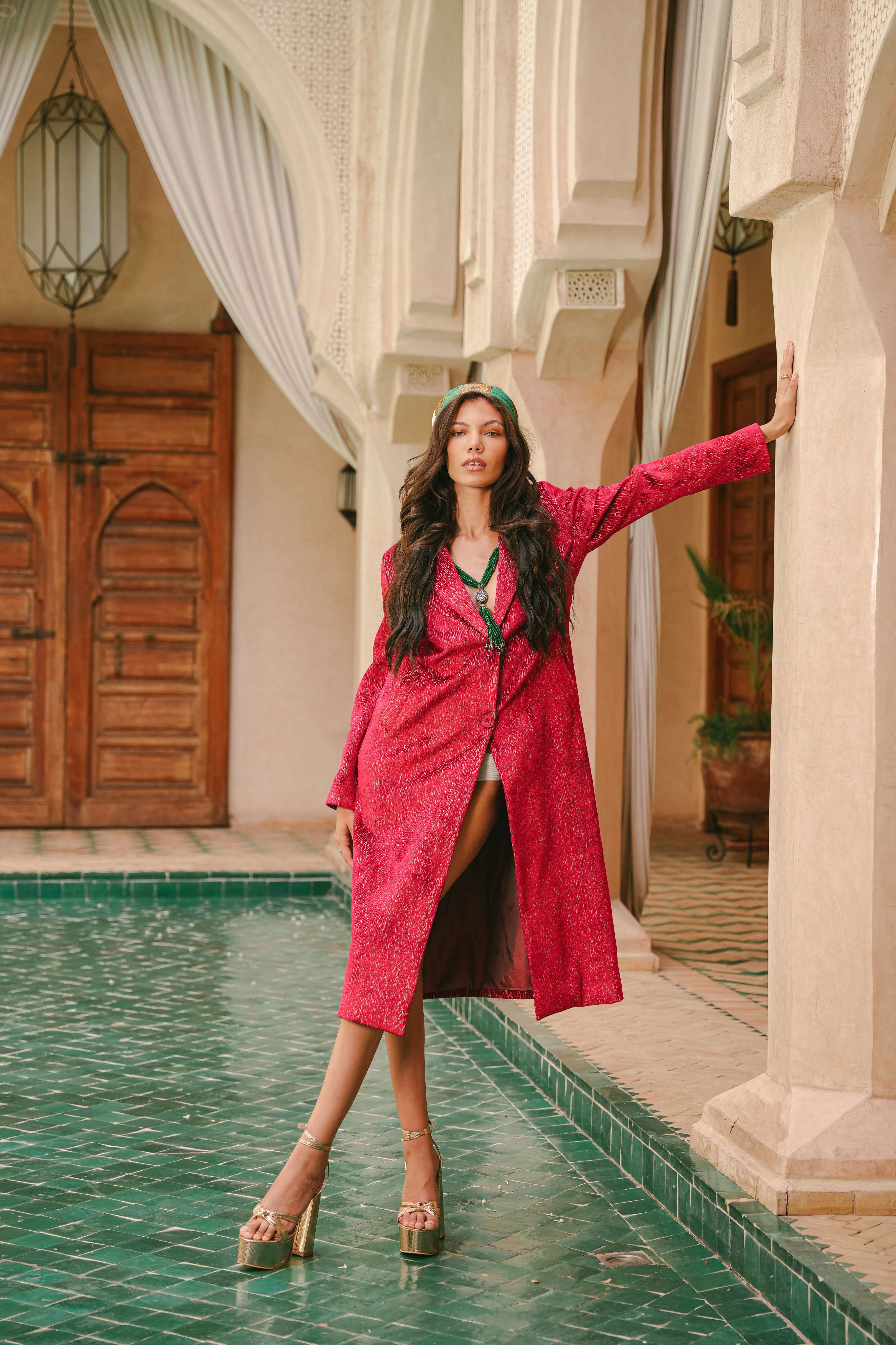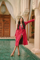 Imagine standing in a tranquil riad courtyard as dusk falls, the sky shifting into an impossible, luminous shade of magenta. This trench coat is an ode to that moment of pure magic. Handcrafted in Morocco, its unique, shimmering fabric catches the light with a subtle iridescence, reminiscent of moonlight on water. It’s a piece of wearable poetry, designed for the woman who is unafraid to command attention with quiet confidence and grace.