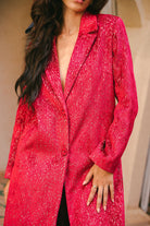 - Single-Breasted, Two-Button Closure: A clean, single-breasted front is secured with two matching magenta buttons, creating a polished and seamless finish.