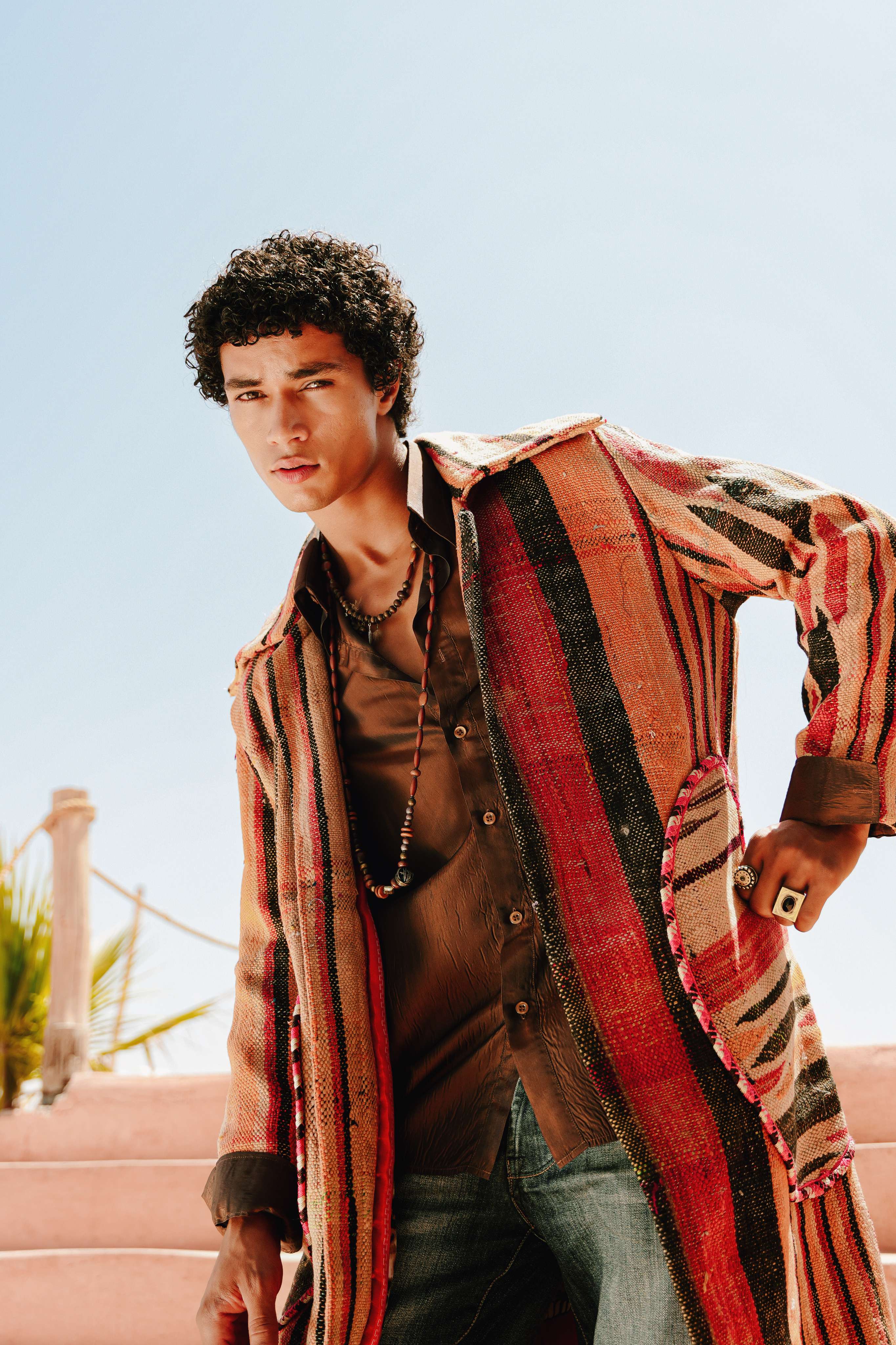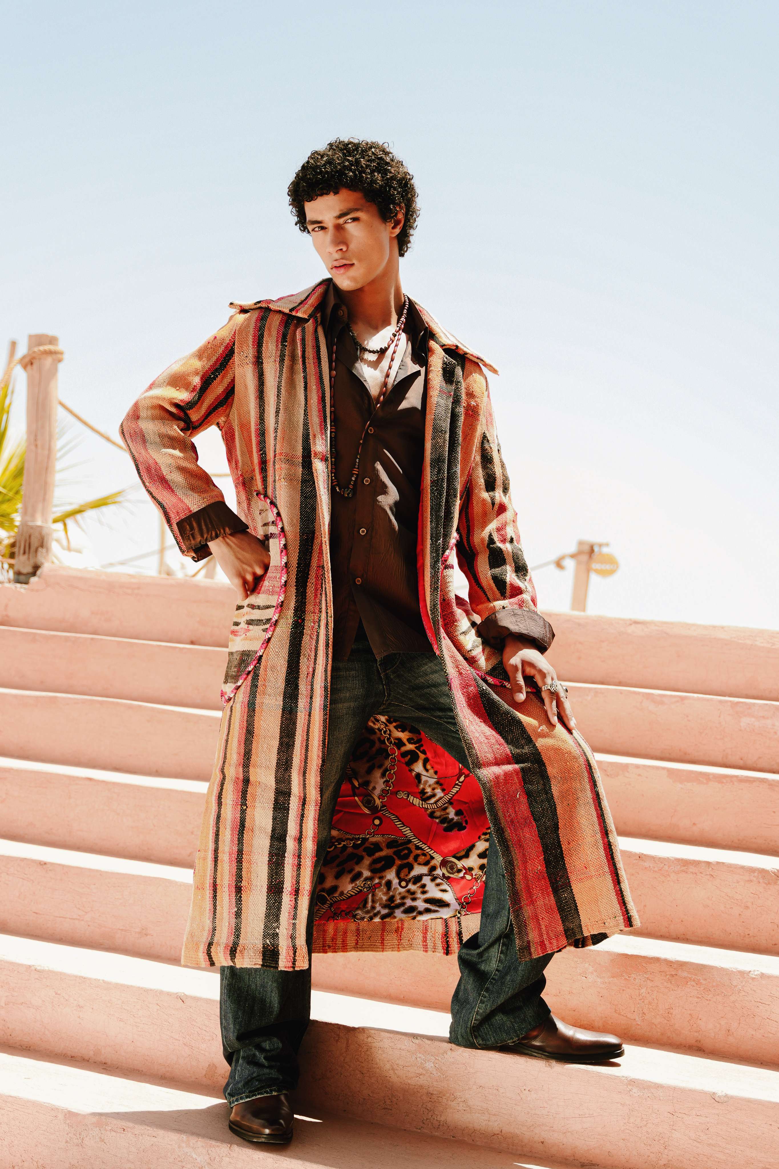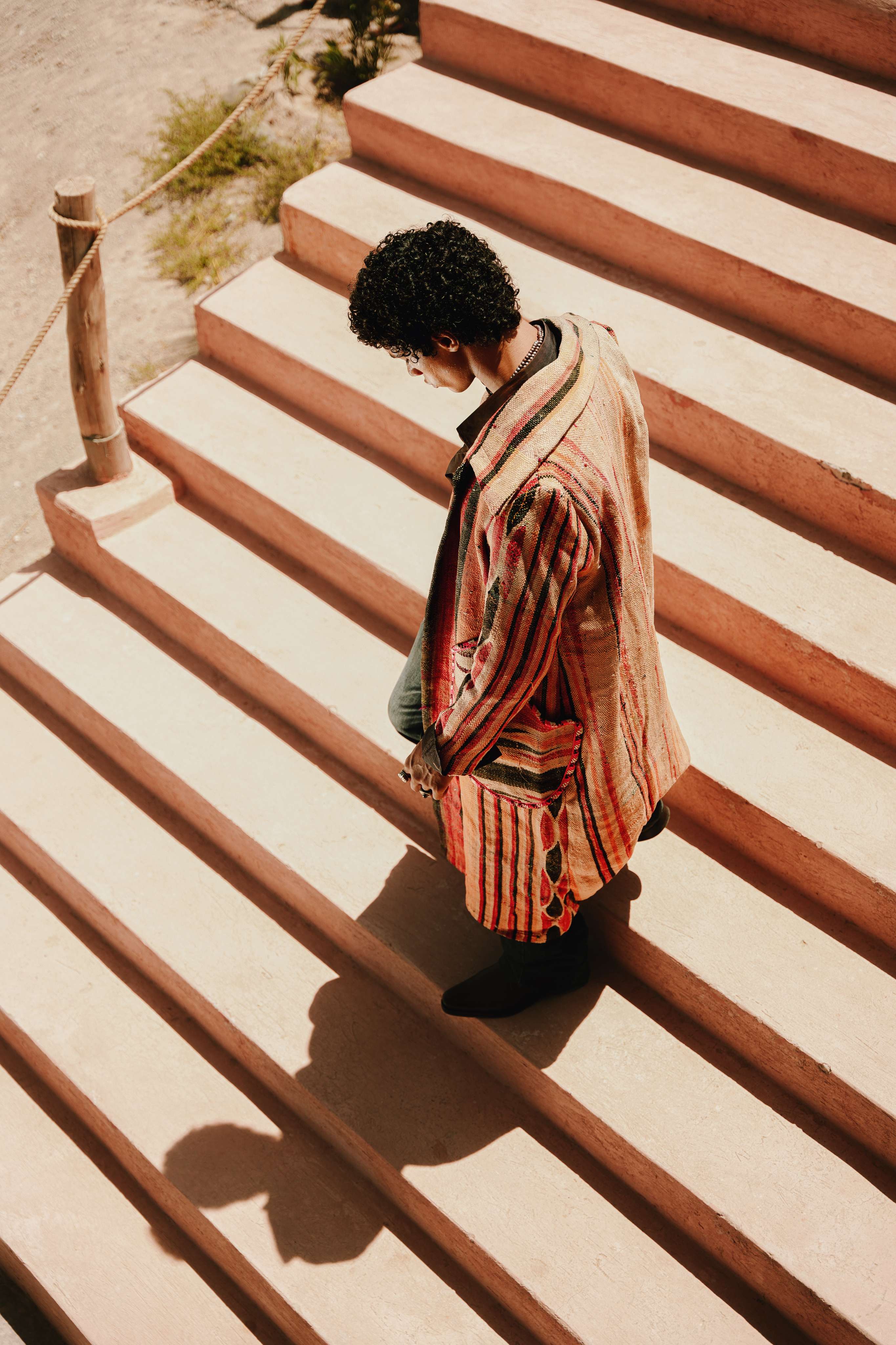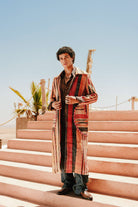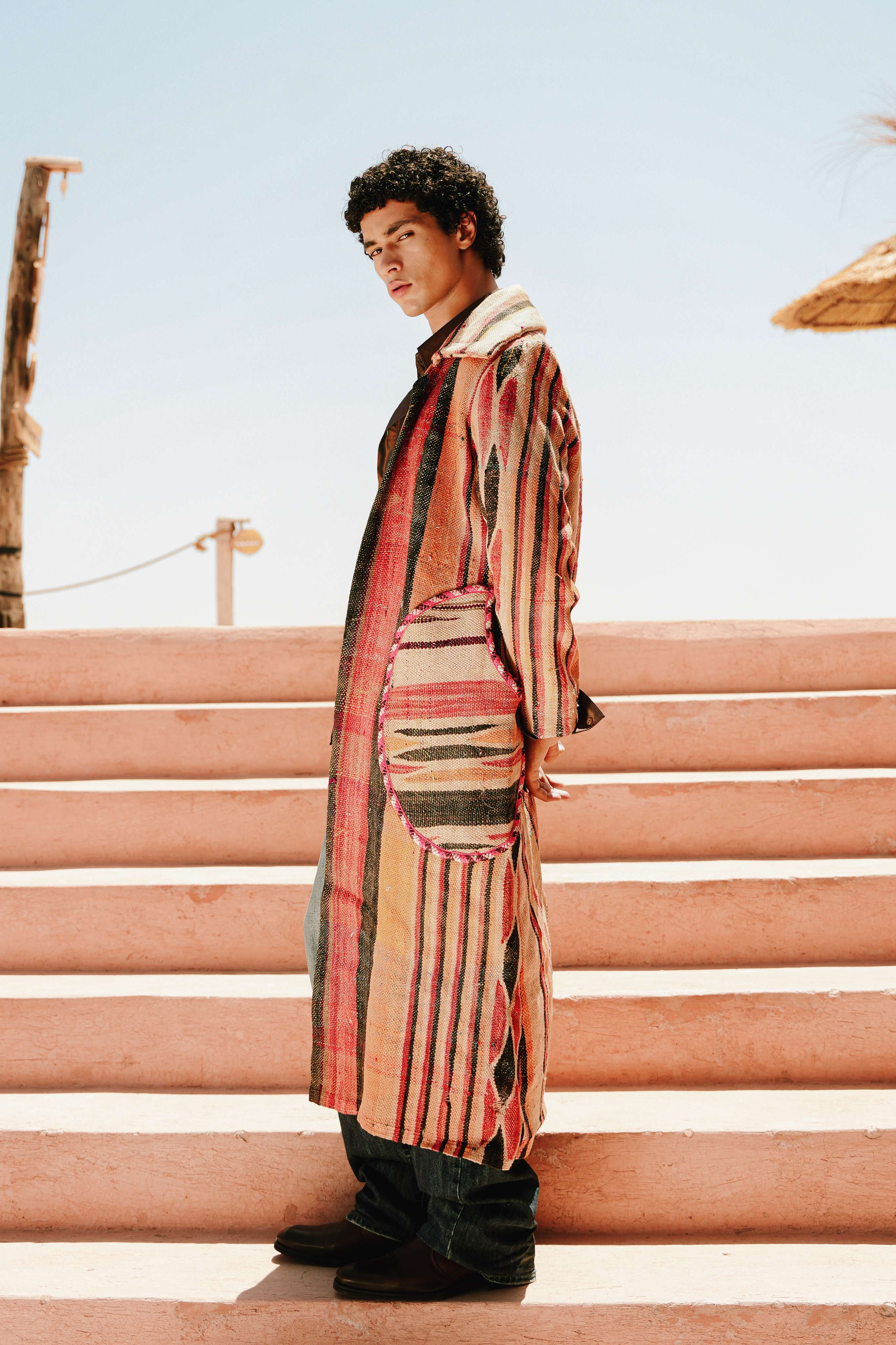 This piece is inspired by the legendary Saharan gateway of Merzouga, where the sand glows in a thousand shades of red and orange as the sun dips below the horizon. The rustic, vertical stripes of the heavy, blanket-like weave echo the shifting colors and long shadows cast across the massive Erg Chebbi dunes. Finished with the wild, untamed secret of a leopard-print lining, this coat is for the adventurer drawn to the raw magic of the desert. Handcrafted in Morocco, it's a powerful, unisex piece for the true wanderer.