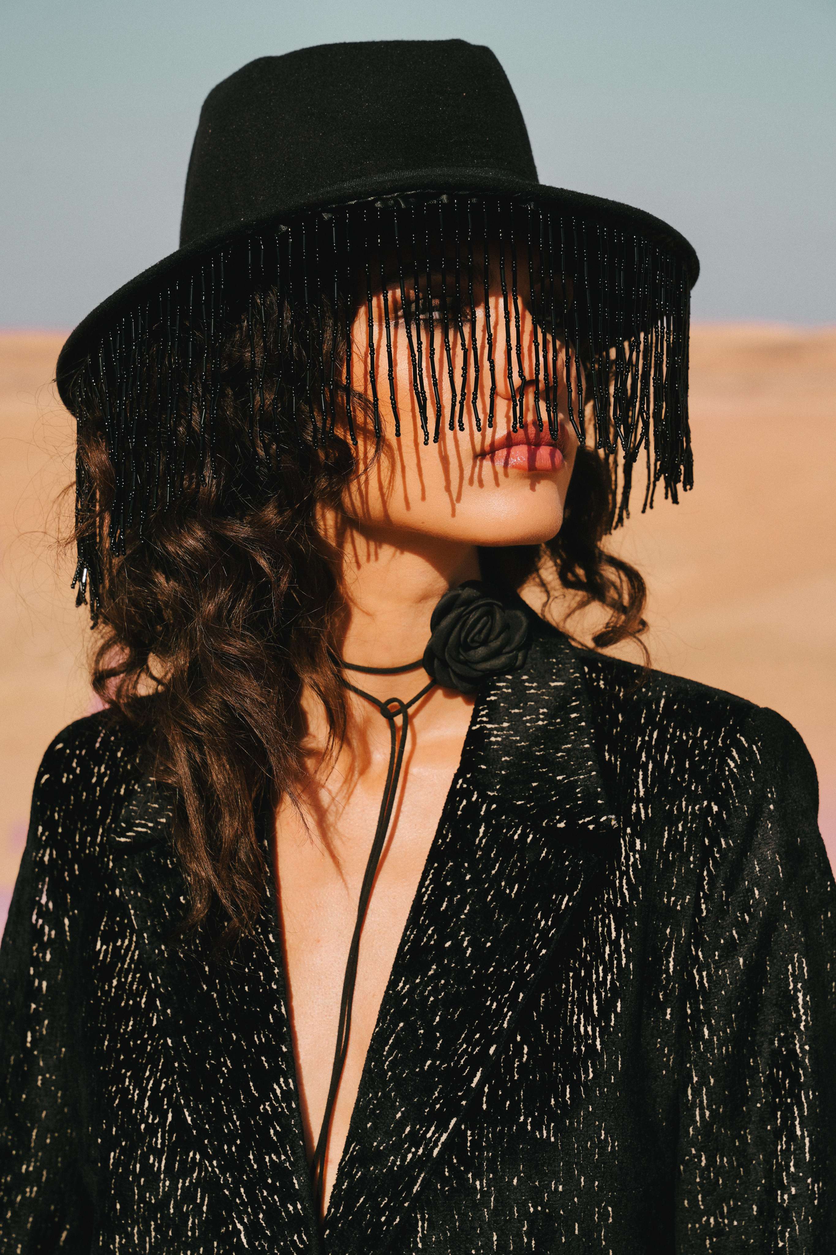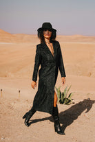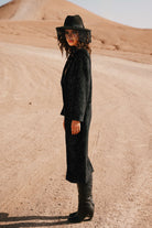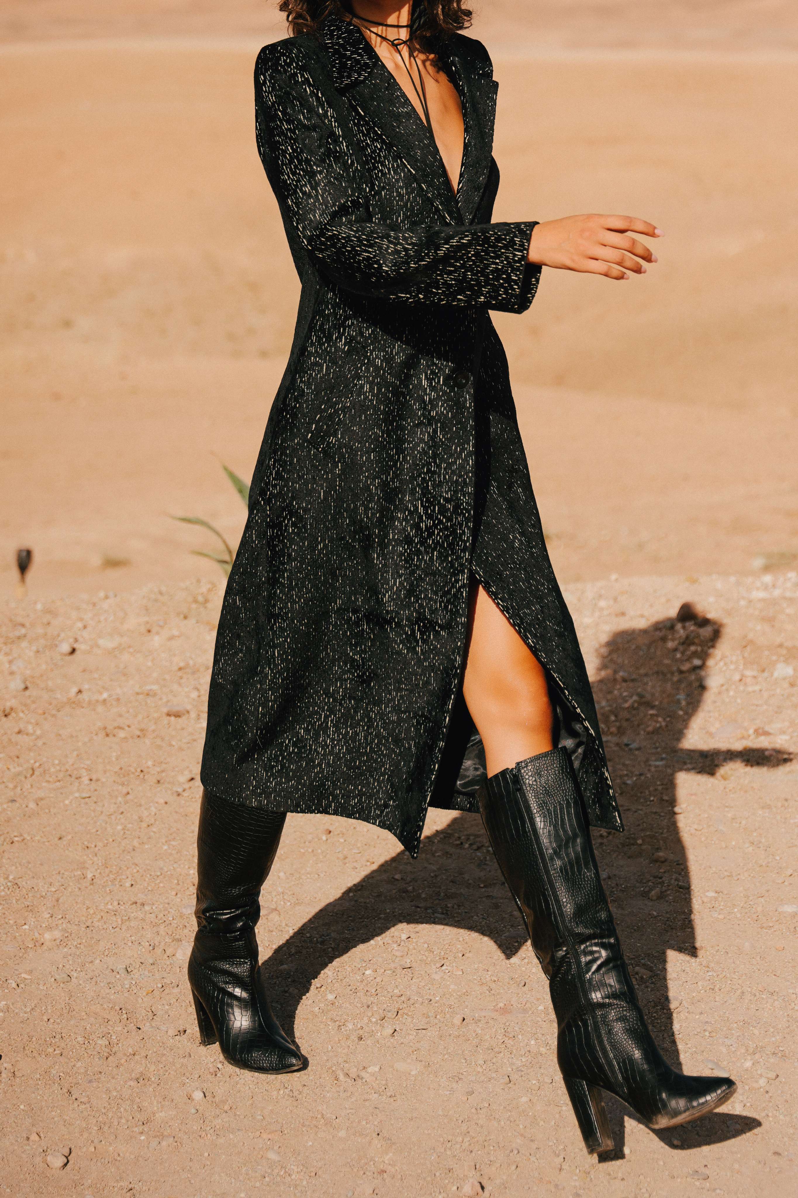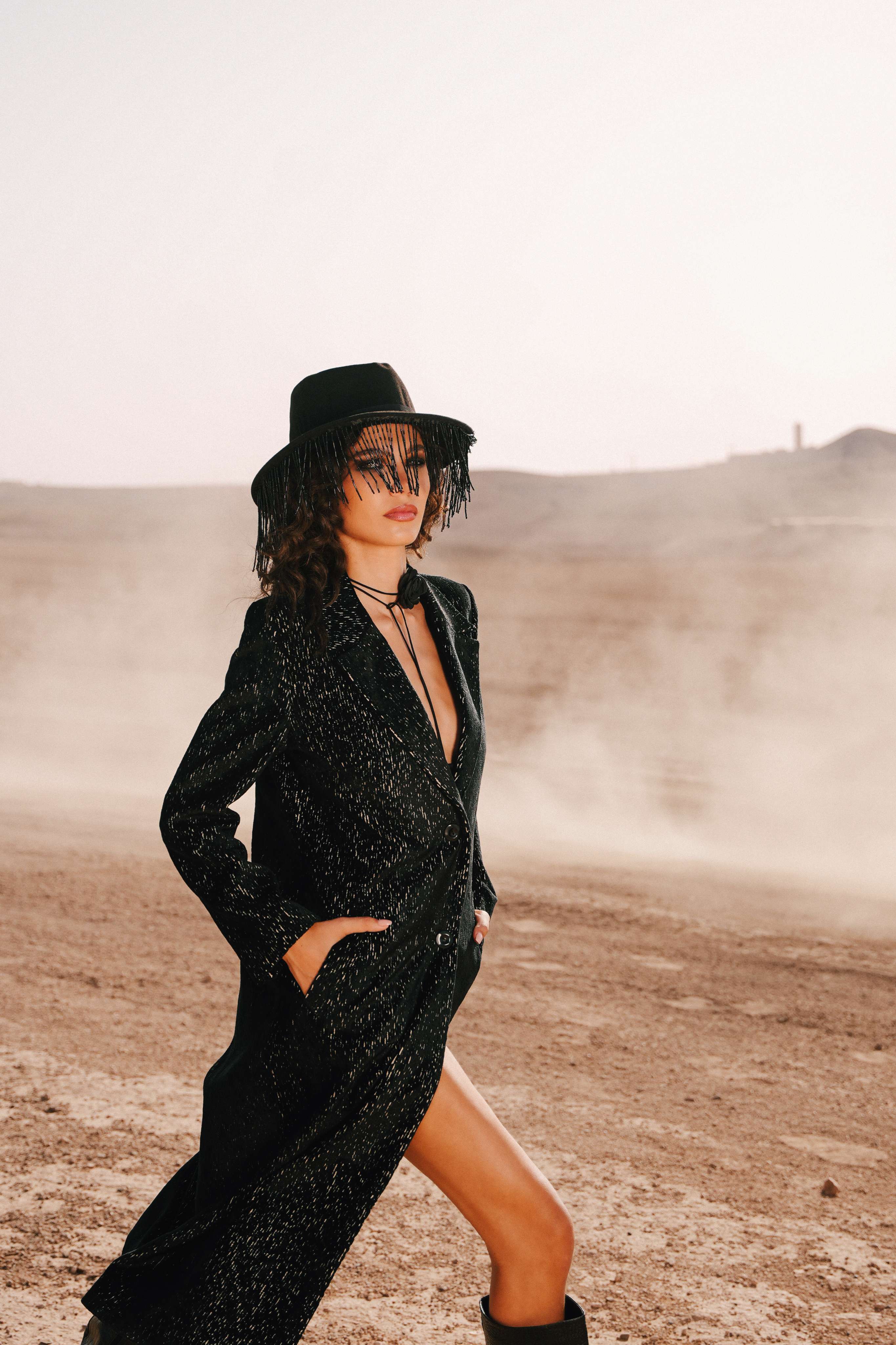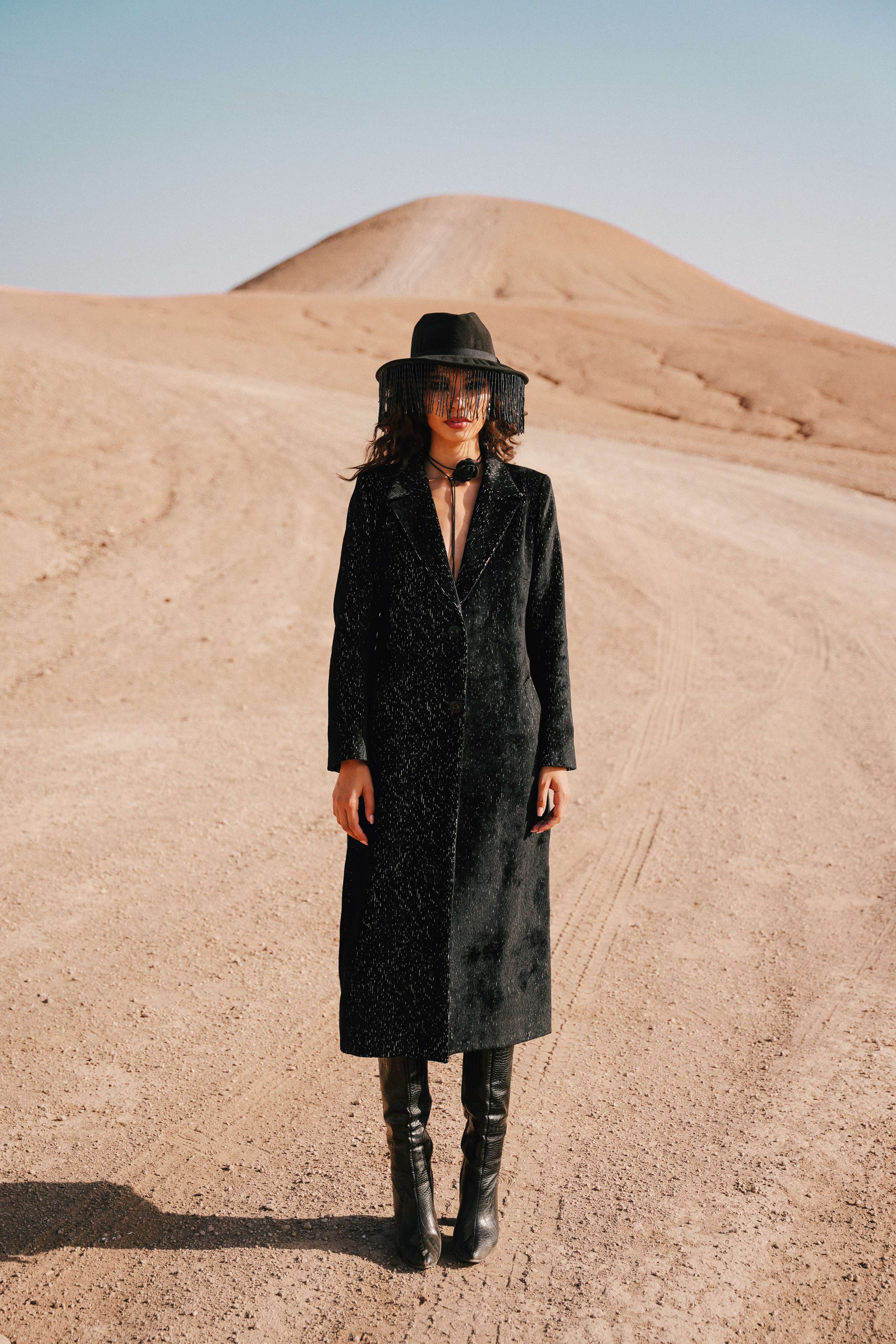 Imagine the Moroccan desert after the sun has set, when the vast, silent landscape is blanketed by a sky of infinite, glittering stars. The Nocturne Trench Coat is an ode to this breathtaking celestial display. Handcrafted in Morocco, its unique, shimmering fabric captures the deep, dark beauty of the night, woven with a subtle light that mimics a distant galaxy. This is not just a coat; it's an experience, a piece of wearable magic for the woman who finds poetry in the darkness.