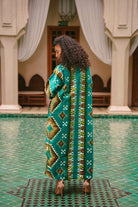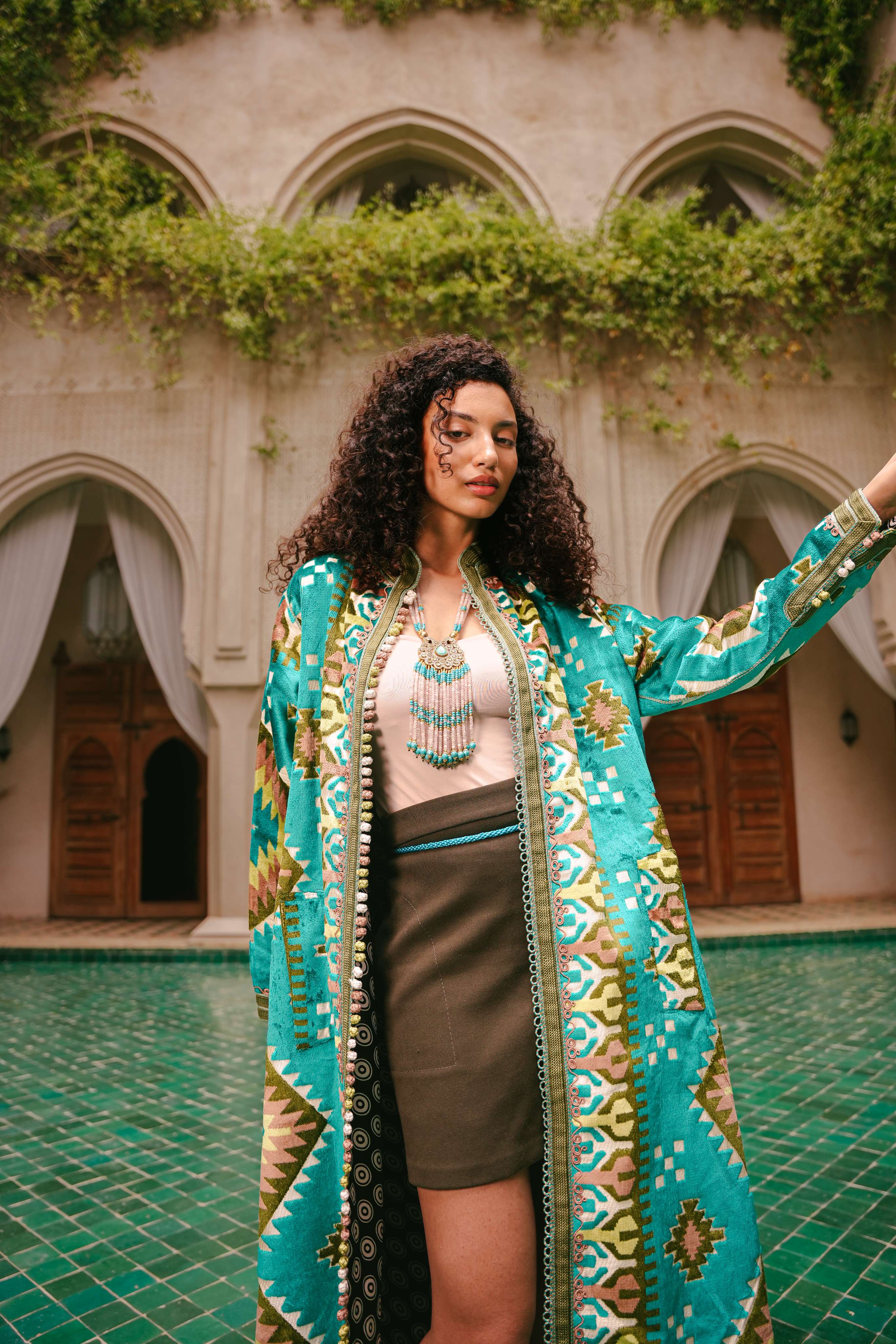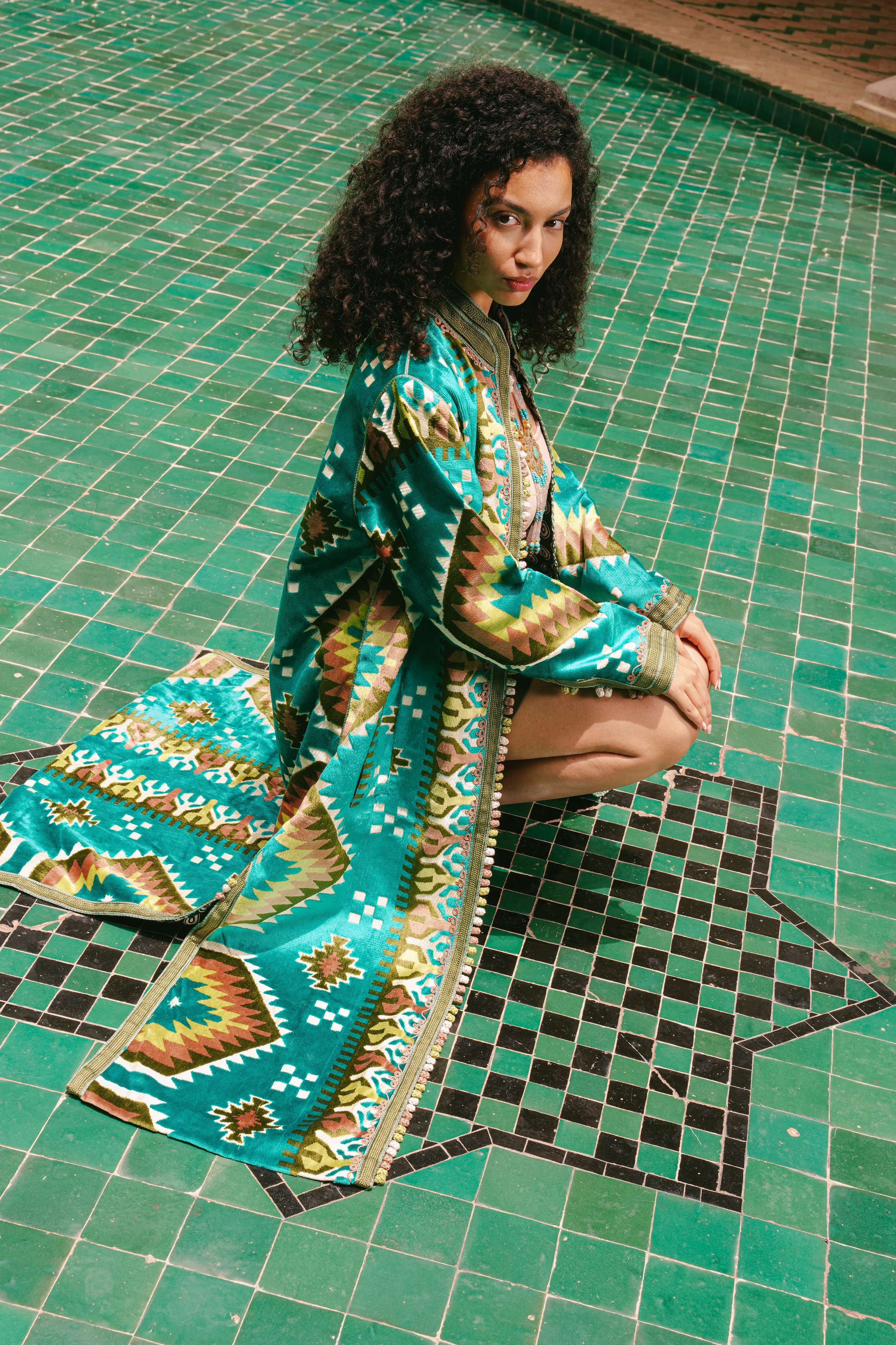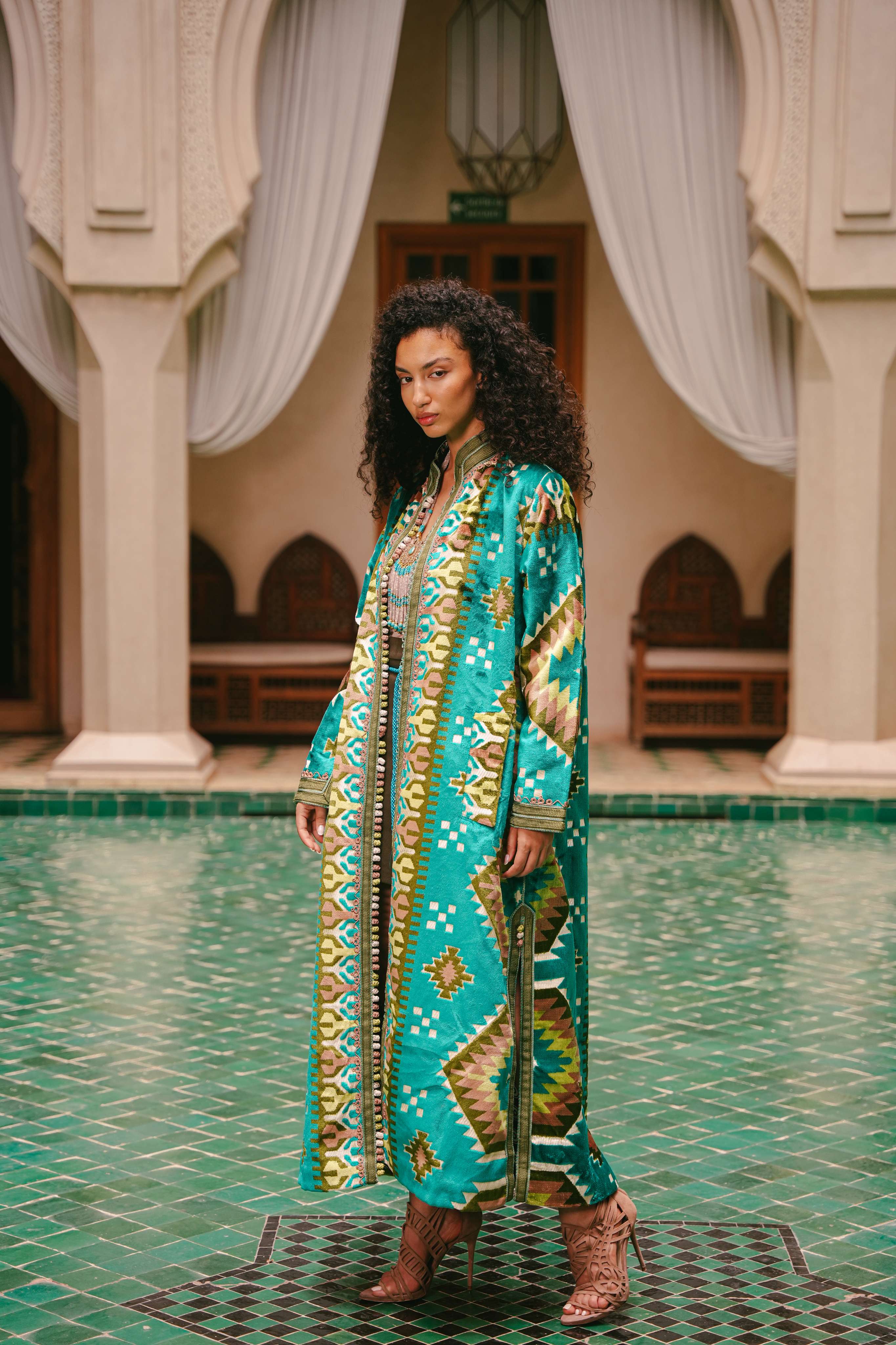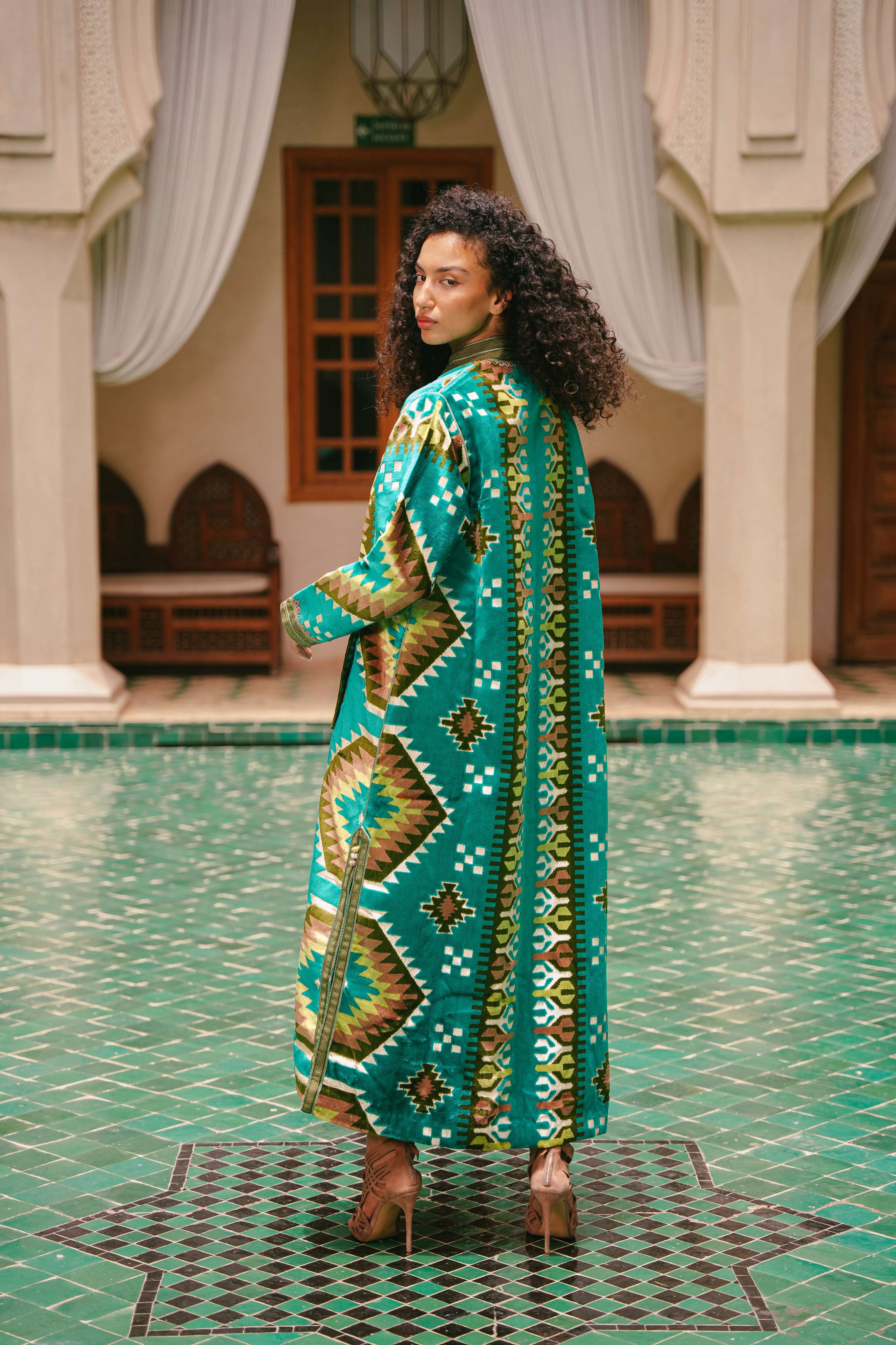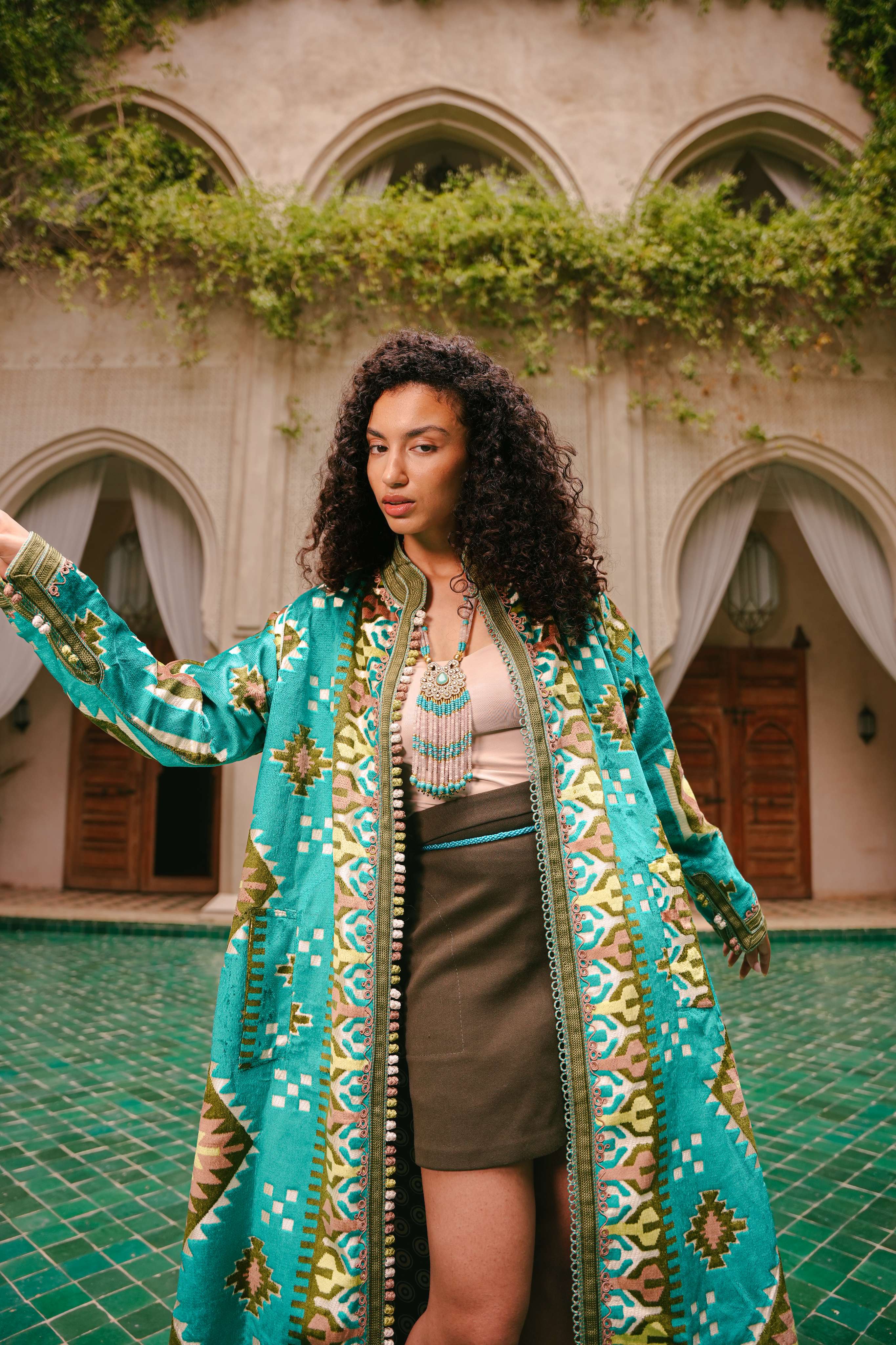 Discover a secret sanctuary hidden from the desert sun, where a tranquil pool reflects the cool turquoise of Zellige tiles. The Oasis Blue Desert Duster is an homage to this serene discovery. Handcrafted in Morocco, its luxurious jacquard weave and intricate, hand-applied trims tell a story of regal elegance and masterful artistry. It’s a timeless garment that wraps you in the quiet luxury of a Moroccan paradise.