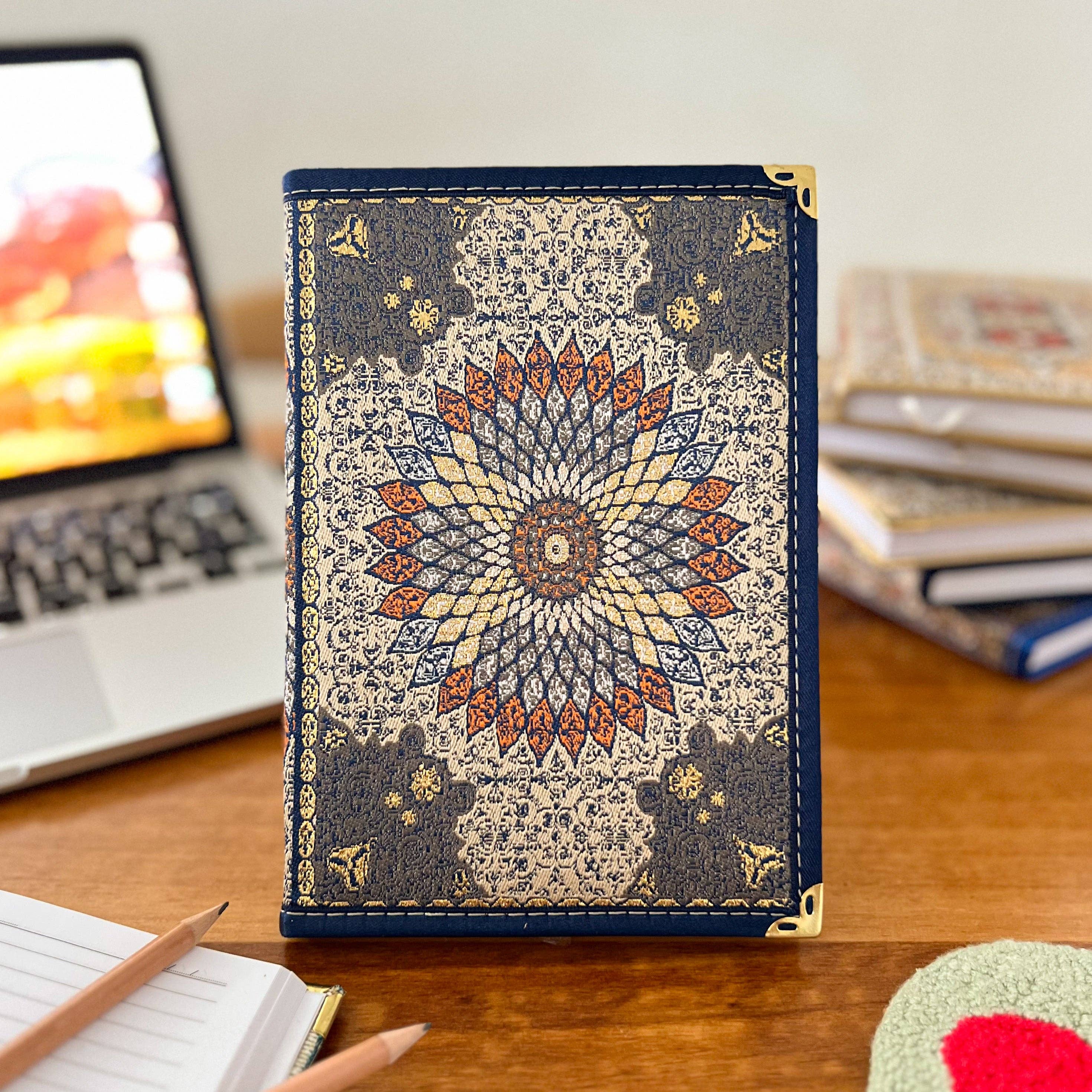 Lush Turkish Carpet Cover: The hardcover is wrapped in a rich brocade fabric, intricately woven with the traditional patterns and jewel-toned colors of an Anatolian carpet, offering a beautiful, tactile experience.