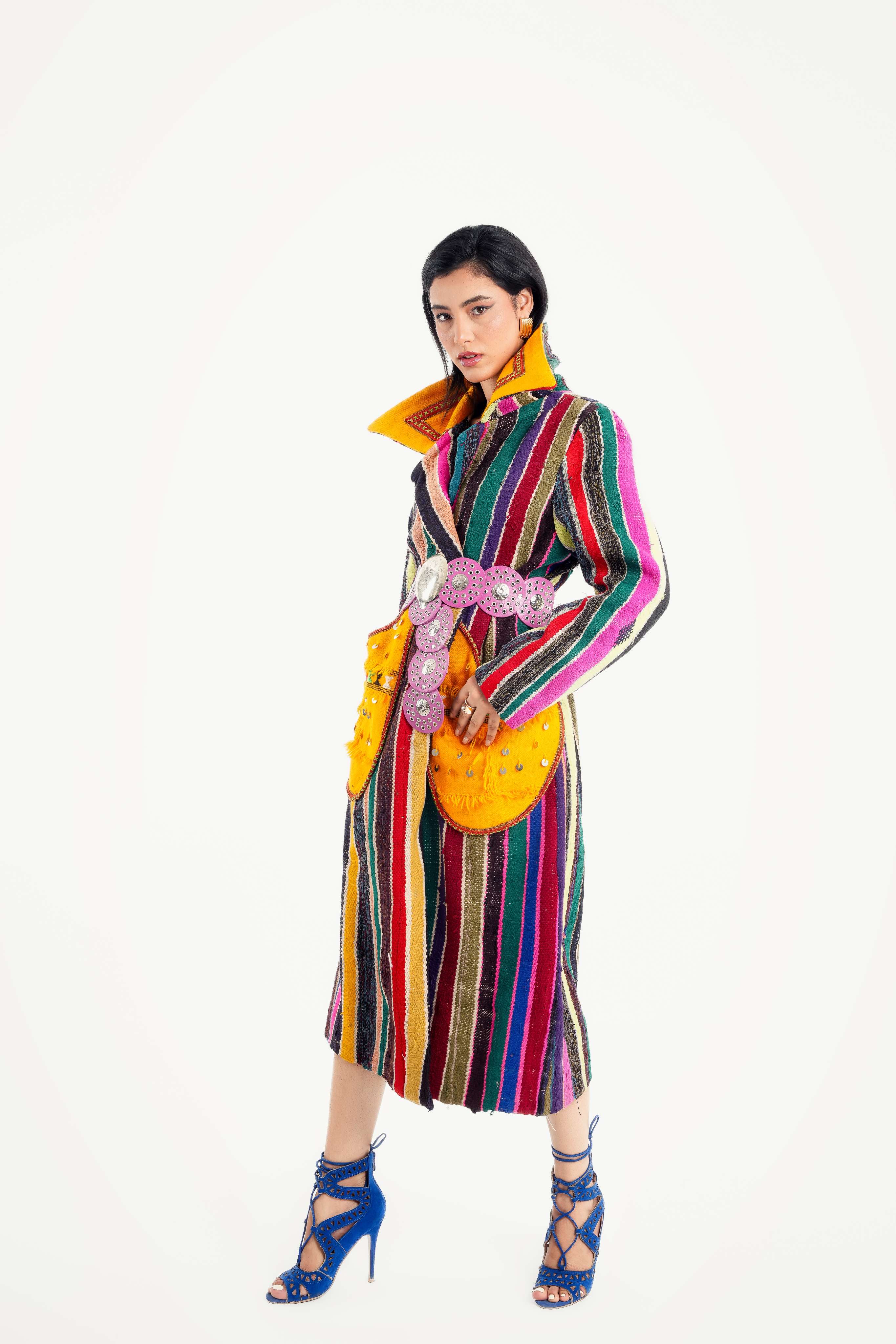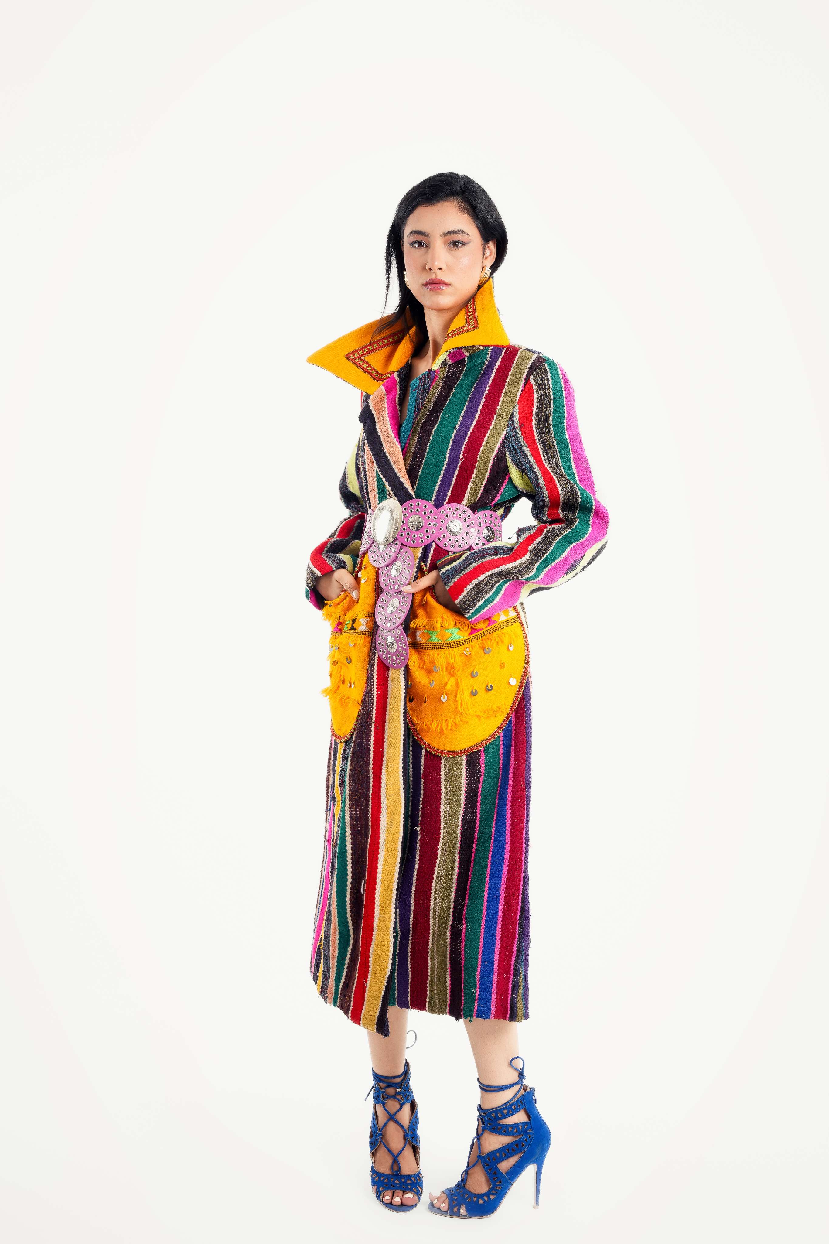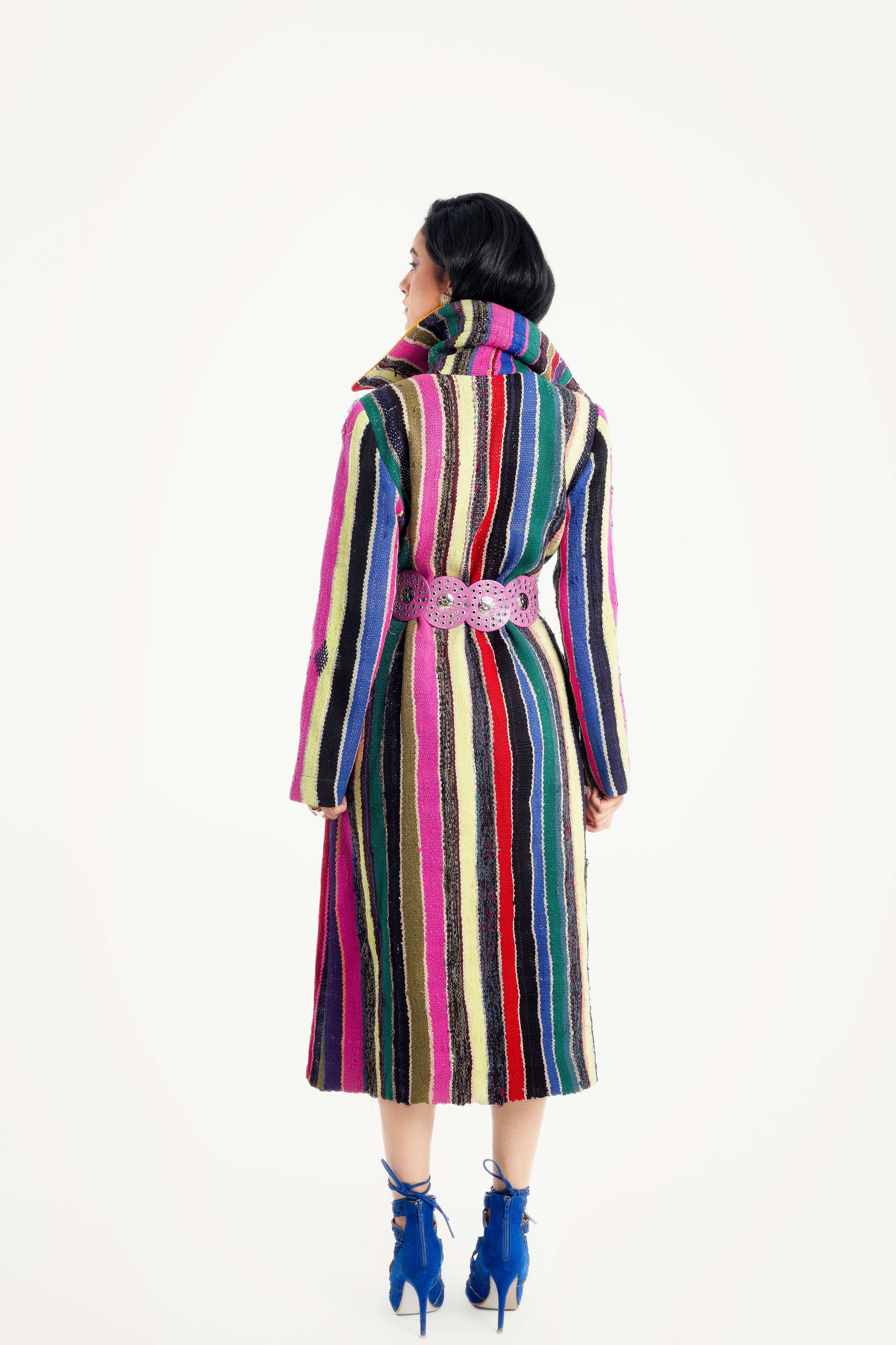 The Sahara Gold Coat is a celebration in itself. Wear it open and flowing to let the rainbow stripes and golden details create a stunning visual effect. For a different silhouette, cinch it at the waist with your own favorite statement belt to create a look of pure opulence. (Please note: belt not included). This coat is destined for unforgettable moments.