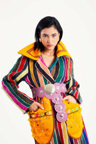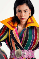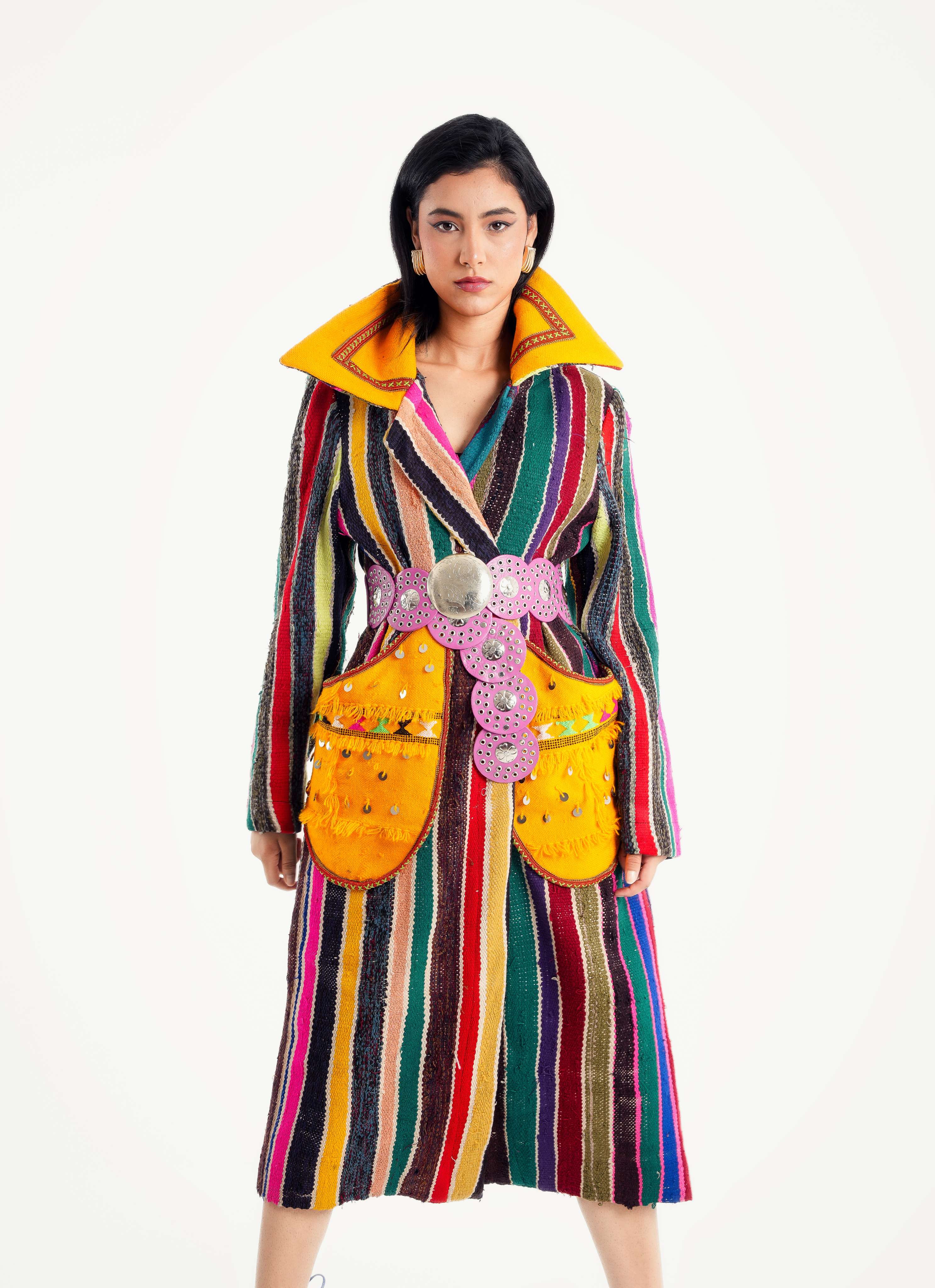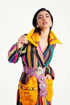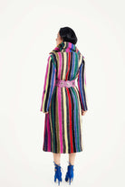 Drape yourself in the golden light of the Sahara with this spectacular trench, a celebratory masterpiece of rainbow stripes and opulent, embellished details.