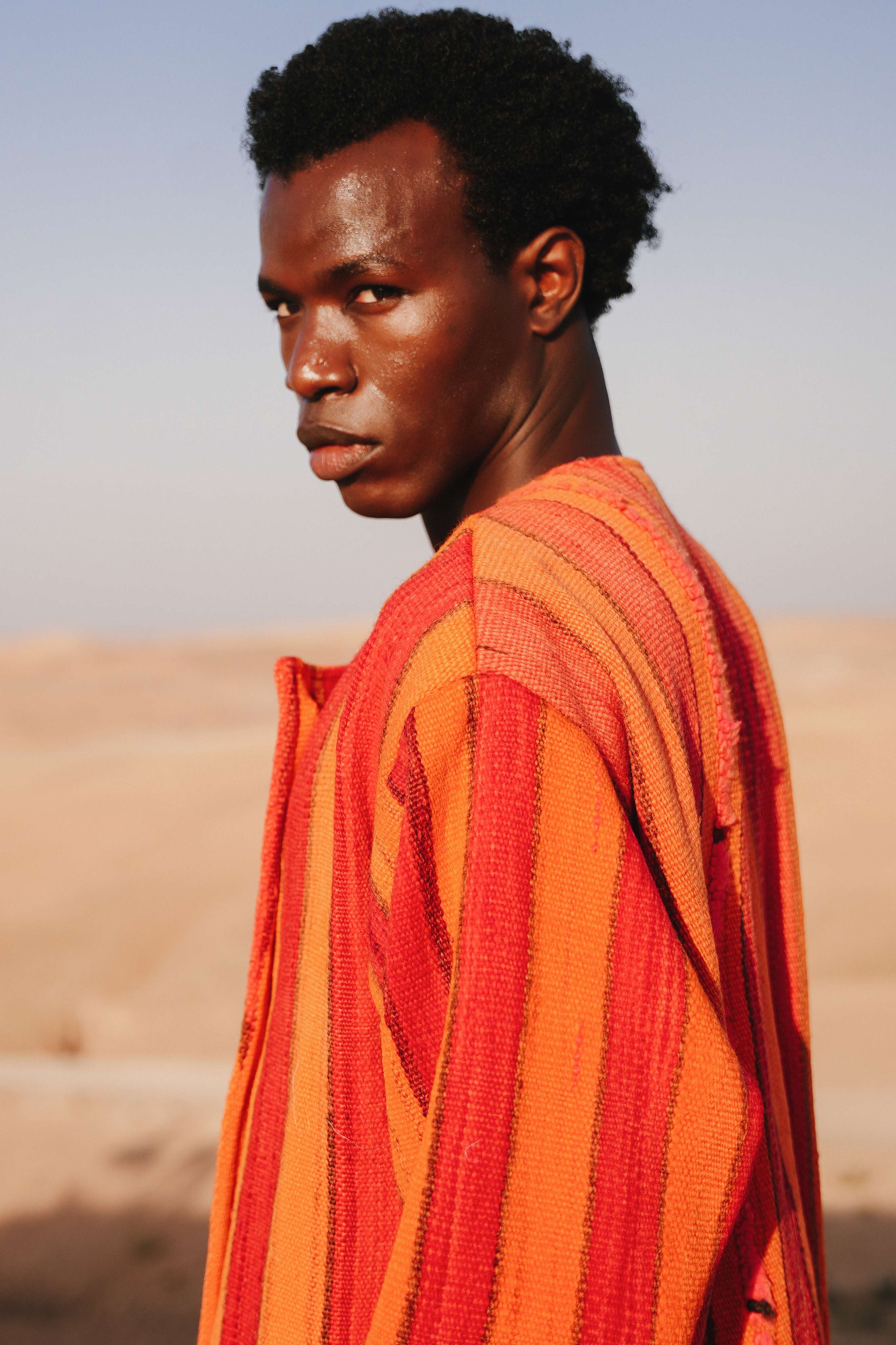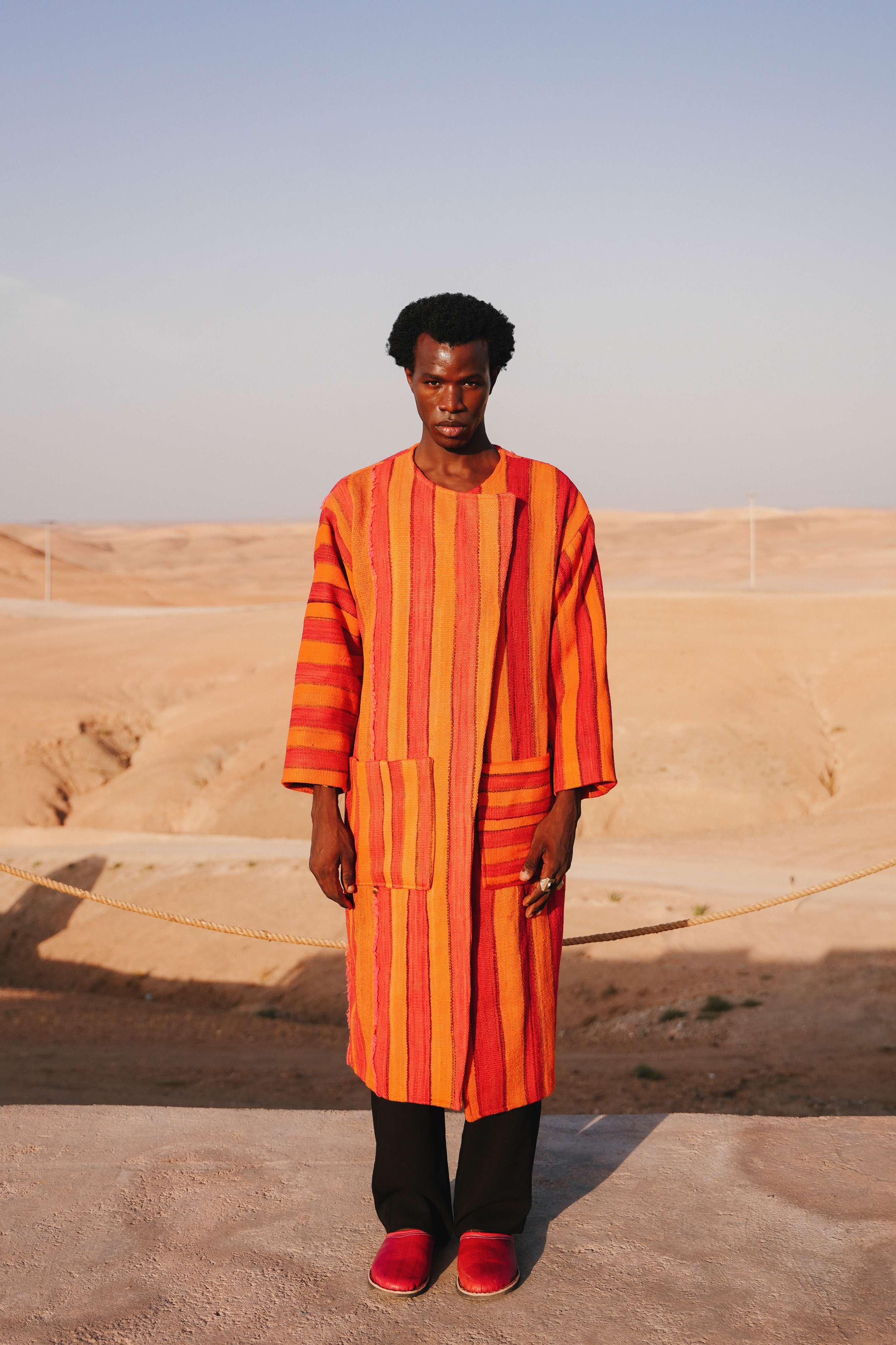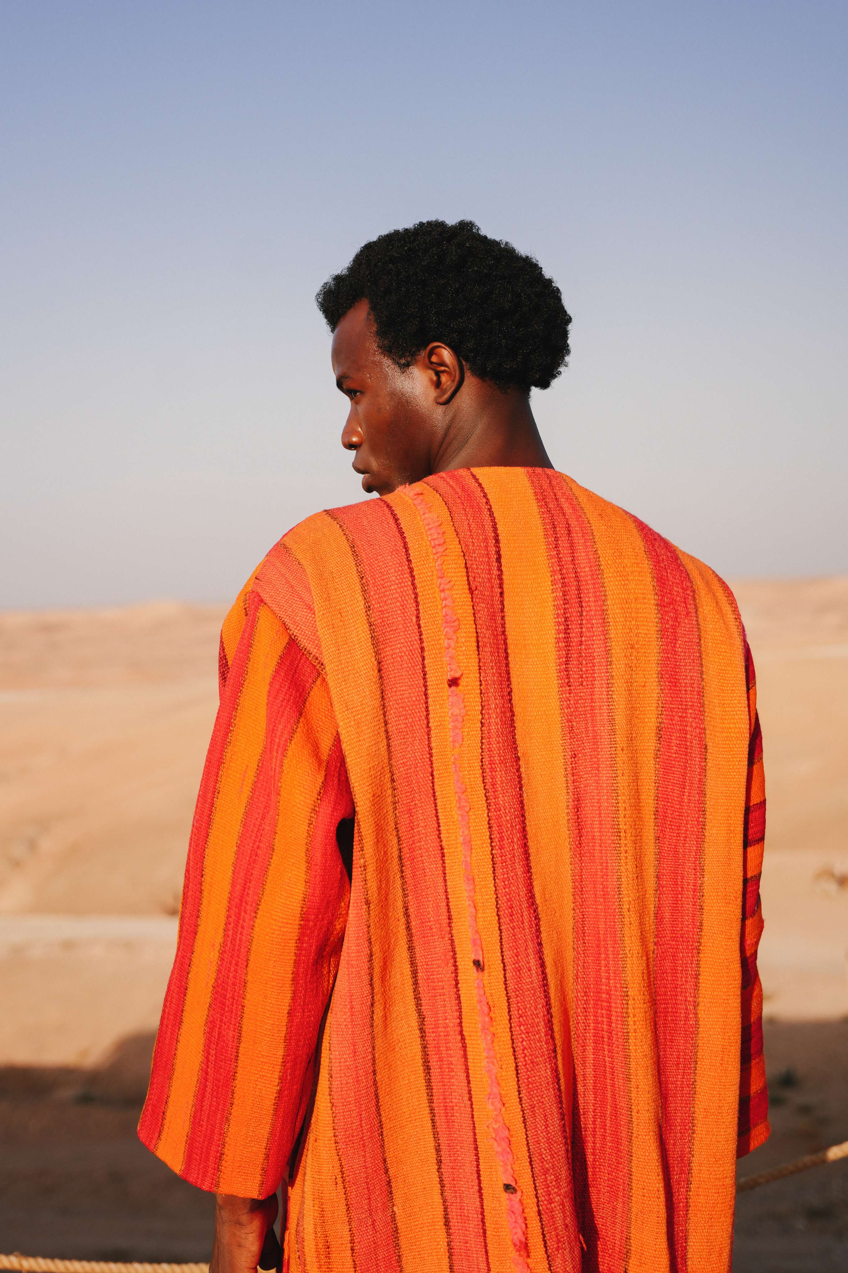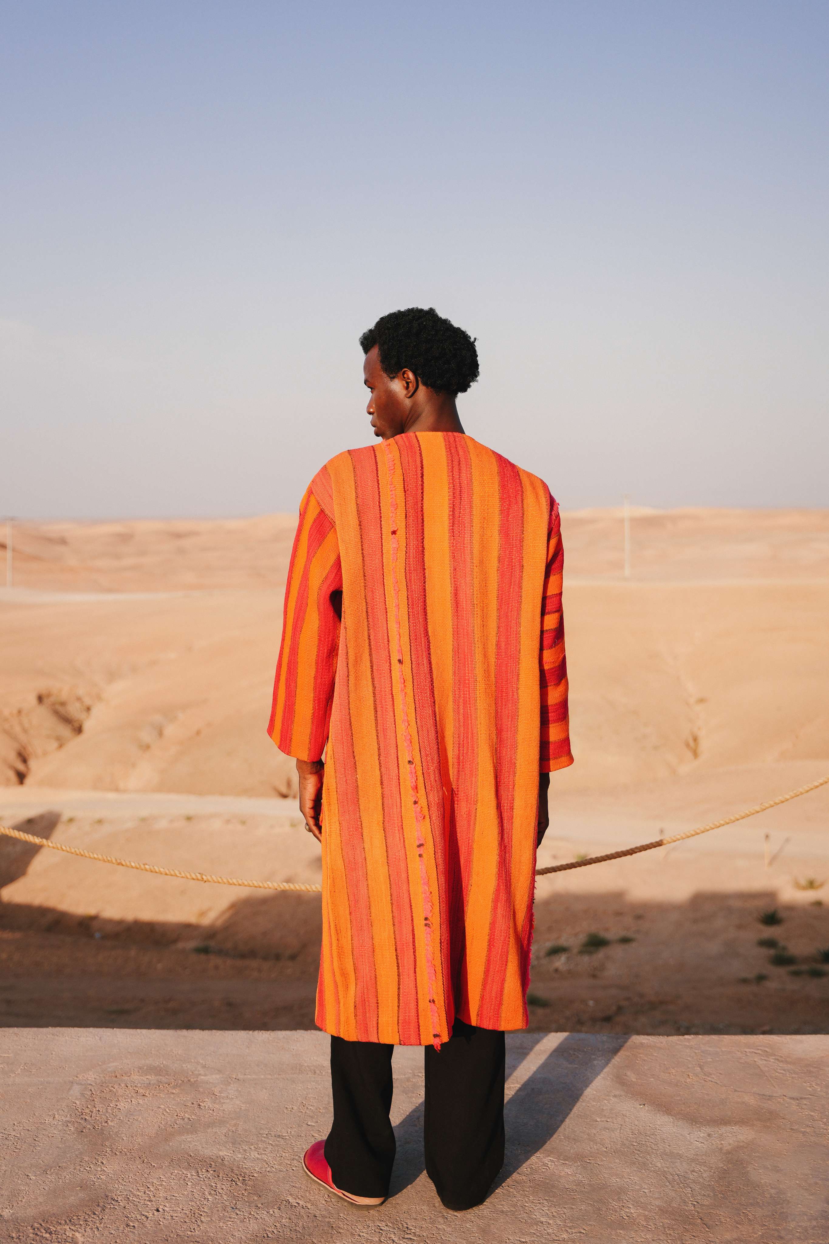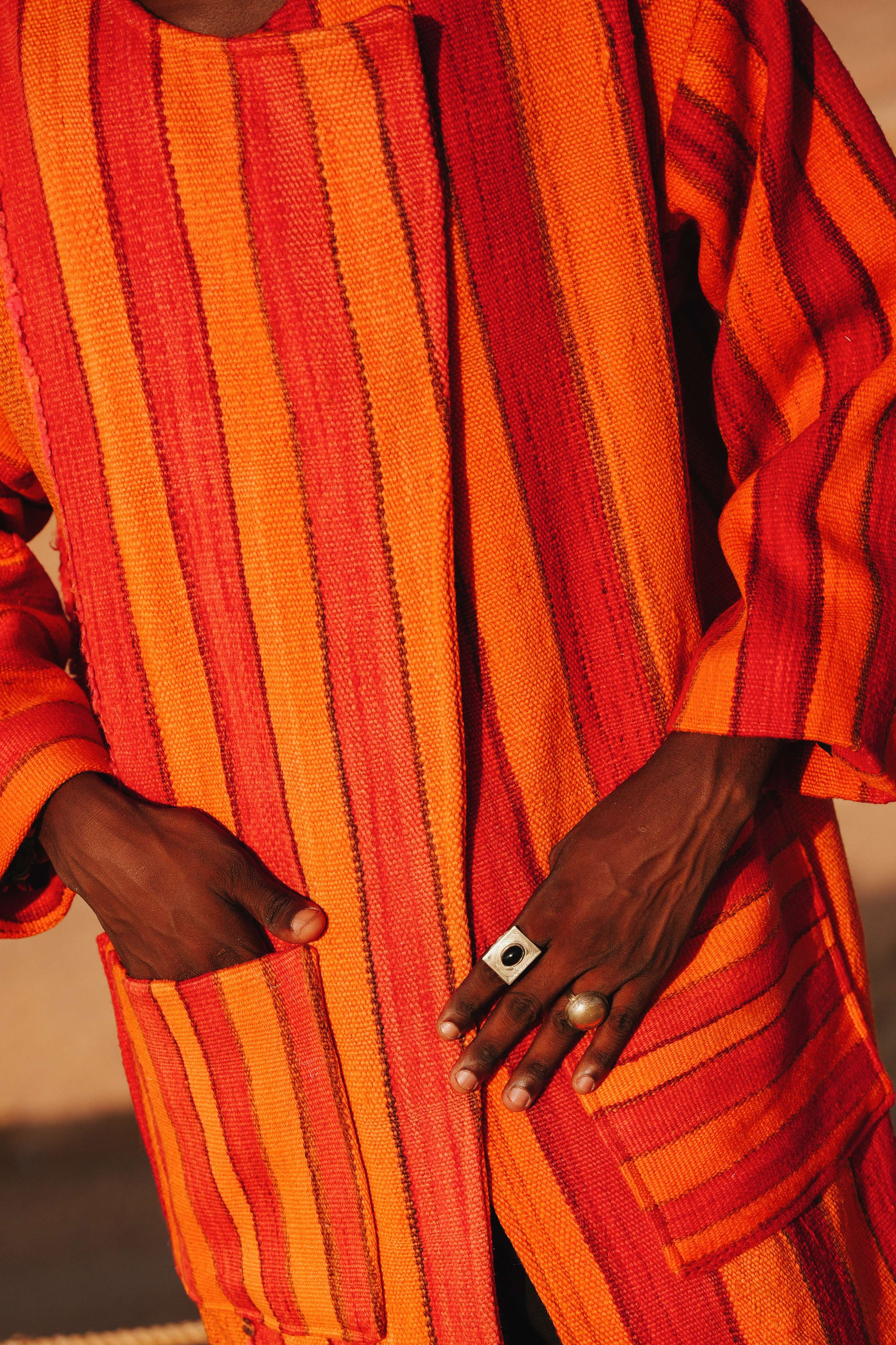 Capture the soul-stirring beauty of the sun dipping below the Saharan dunes, painting the sky in strokes of fire and terracotta. The Sahara Sol Peacoat is an ode to this magical moment. Handcrafted in Morocco from a substantial, blanket-like weave, its vibrant stripes echo the intense, shifting colors of a desert sunset. This is a coat that radiates warmth and artistic spirit, designed for the individual who carries the sun with them.