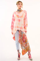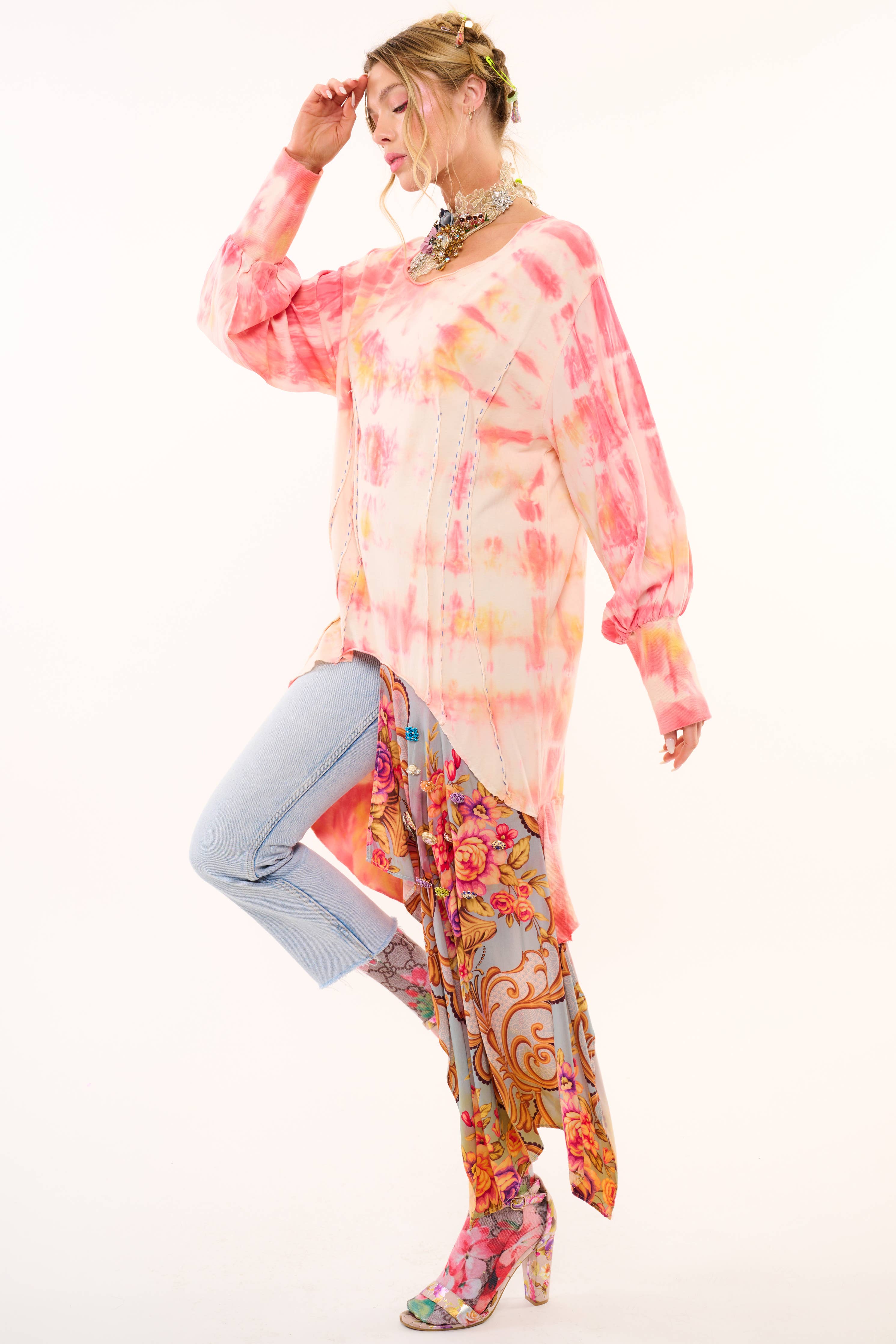 This piece tells a story of beautiful contradictions. It’s the memory of a perfect, hazy sunset over the Pacific, its soft pink and sherbet hues bleeding together in a dreamy watercolor wash. Then, as if discovering a hidden treasure, a panel of opulent, baroque-style silk cascades from the hem—a vibrant bloom of florals and scrolls from another era. It’s a top for the artist, the romantic, and the collector of beautiful, unexpected things, blending bohemian ease with a touch of theatrical glamour.