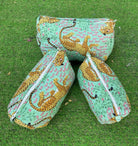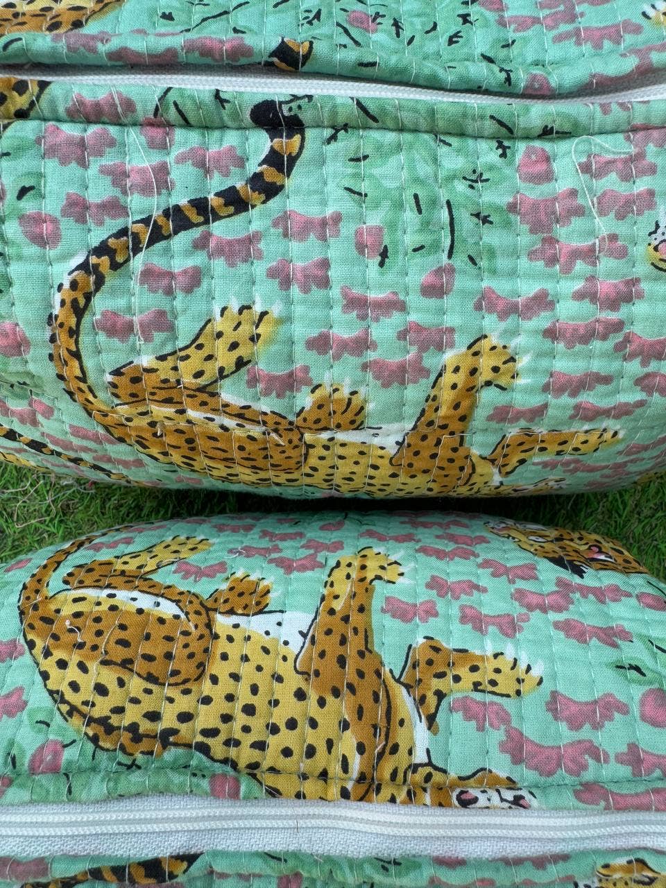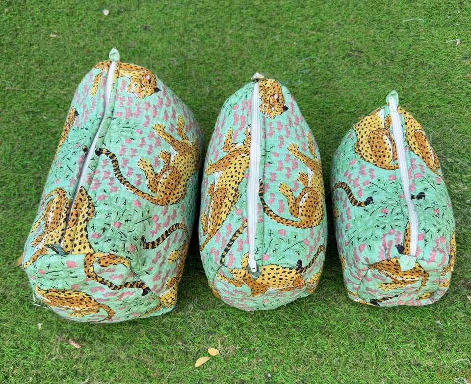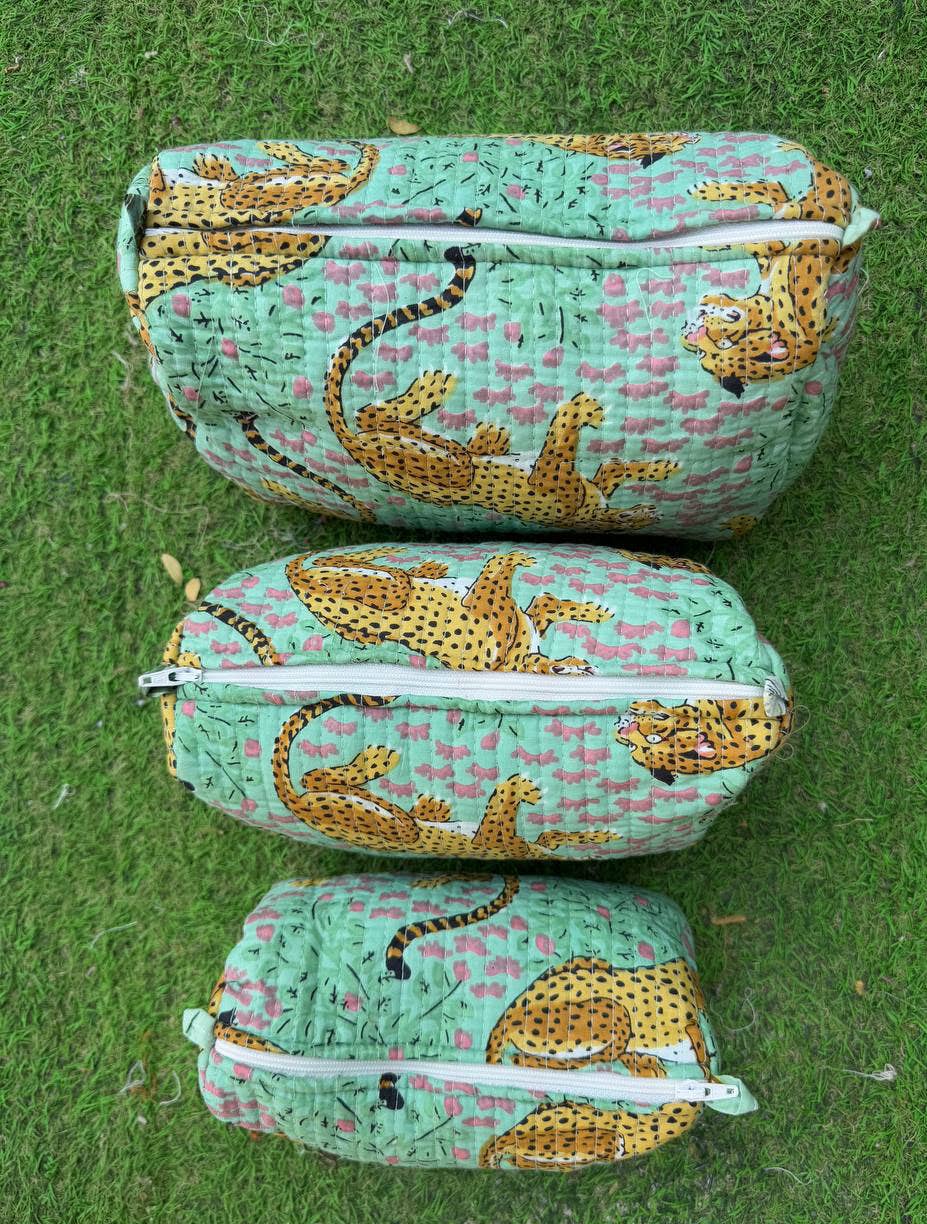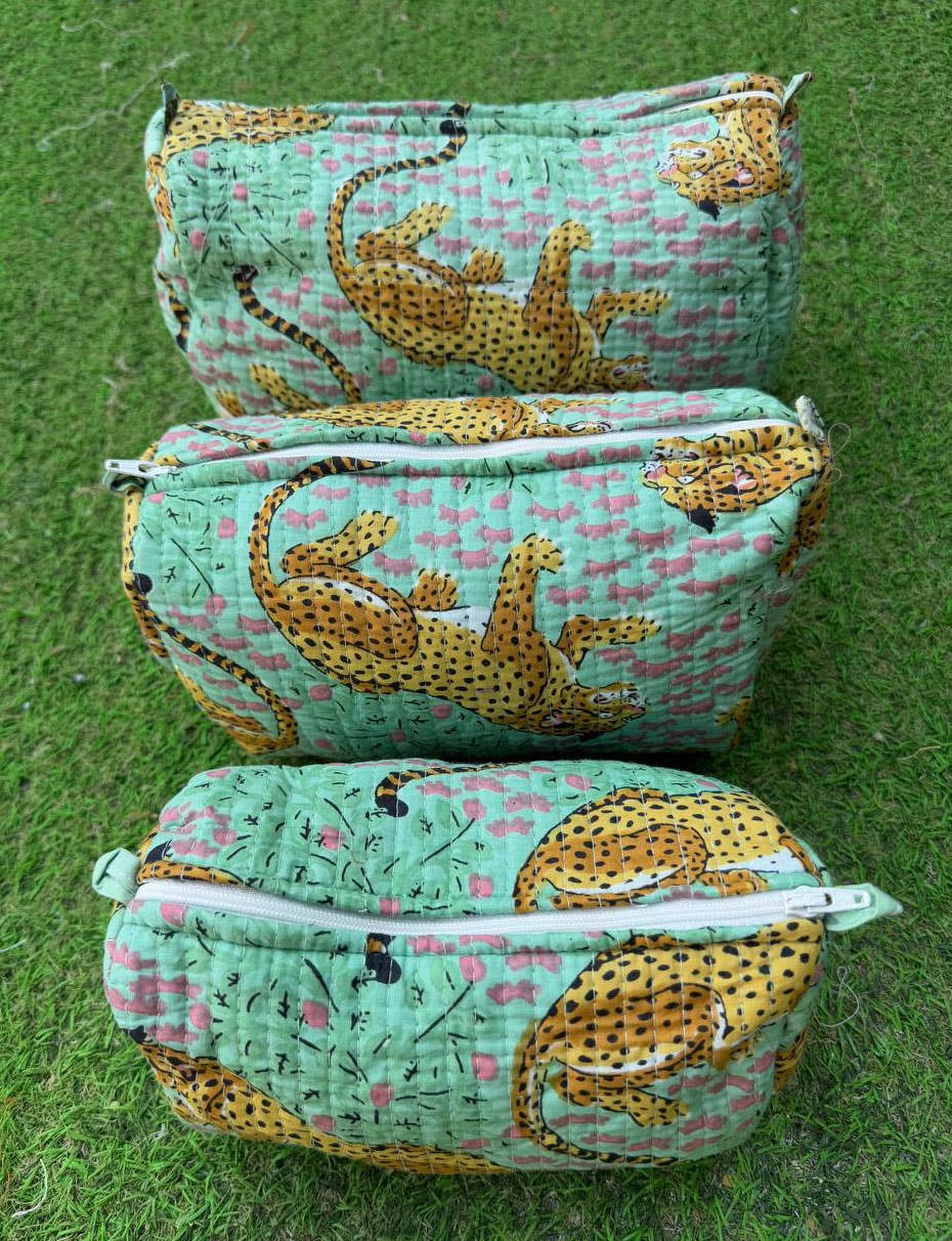 This trio of pouches is a dispatch from a sun-drenched workshop in Rajasthan, where the ancient art of block printing comes to life. Imagine artisans pressing hand-carved wooden blocks onto soft cotton, revealing a parade of majestic leopards against a cool mint landscape. Each bag is a small, quilted sanctuary, a testament to the beauty of slow craft and women's enterprise, designed to bring a little piece of artful order to your adventures.