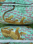 Artisanal Hand-Block Print: A captivating pattern of golden leopards and delicate rose-pink accents is hand-printed onto a mint-green cotton background, ensuring that each bag has unique, subtle variations that speak to its handmade origins.